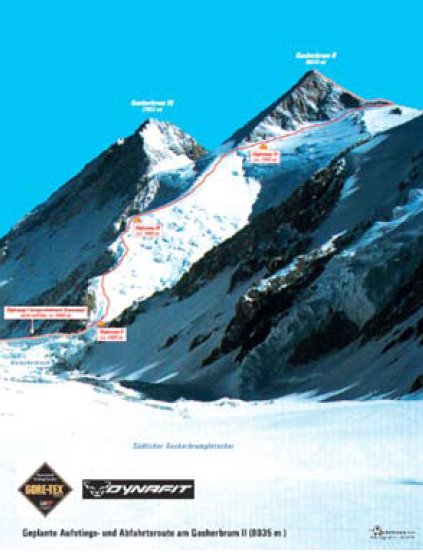 Da die Fortbewegung mit Skiern für die beiden Skibergsteiger die schönste und eleganteste Art ist, Berge zu besteigen und abzufahren, führte sie Ende Juni ihr Weg zum 13. höchsten Gipfel der Erde, dem 8035 Meter hohen Gasherbrum II. Die Herausforderung, den Skitourenrennlauf auf die hohen Berge der Erde zu übertragen, war dabei die grundlegende Idee. Ein waghalsiges und nicht ungefährliches Unternehmen, nicht einmal eine handvoll Skibergsteiger wagten sich bis zum heutigen Tag erfolgreich die steilen Eispassagen des gigantischen Achttausenders hinunter.