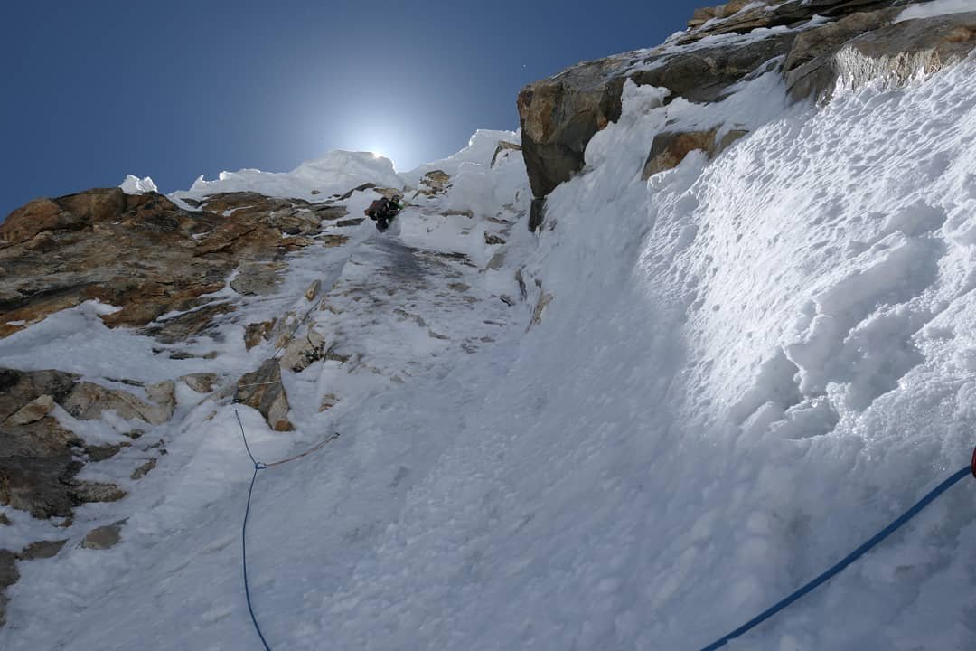 Die technischen Schwierigkeiten waren nie extrem. Ein paar Stellen waren ein bisschen herausfordernder, aber das meiste war eigentlich moderates Eis- und Mixed Klettern. Die größte Herausforderung war die Länge der Route und die Sicherheit. Der Sicherheitsaspekt war auch der Grund warum wir am ersten Tag während der Nacht kletterten und warum wir einen großen Teil unseres Abstiegs in der Nacht machten.