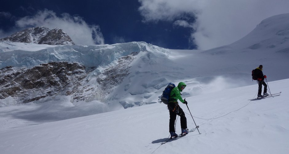 Der Gipfeltag begann kalt – die Bergsteiger hatten bereits im Daunenanzug in den Schlafsäcken genächtigt. Um 2.15 Uhr brachen sie auf und stiegen mit Pickeln ohne Fixseile über 40-45 Grad steile Hänge – wechselnd durch Schnee oder über Blankeis. Angesichts der Verhältnisse entschieden sie sich, anstelle der Normalroute auf den Zentralgipfel, die Inaki-Variante durch die Nordost-Wand des Gipfels zum Hauptgipfel zu versuchen. Diese führte sie – bei zunächst traumhaft schönem Wetter - durch eine bis zu 50 Grad steile Rinne, in der knietiefer Schnee mit pickelhartem, blauem Wassereis abwechselte. Nach einigen Schneeflanken war eine Einsattelung unterhalb des ausgesetzten Gipfelgrates erreicht. Dort jedoch überraschte die Bergsteiger ein jäh zunehmender Wind. „Die Böen erreichten Geschwindigkeiten, die uns ein paar Mal regelrecht von den Füßen hoben“, berichtet von Melle. Sie sahen ihre Chancen schon dahinschwinden. Nach einer halben Stunde Wartezeit jedoch wurde der Wind schwächer, am kurzen Seil starteten sie einen Versuch - und erreichten über den messerscharfen Grat einen Vorgipfel. „Zuvor haben wir unsere Ski an einer sicheren Stelle tief in den Schnee eingerammt, so dass sie der Sturm nicht hinfort reißen kann“, schildert Stitzinger. Bald war dann auch der kurze, aber sehr exponierte Verbindungsgrad zum Hauptgipfel überwunden und um 13.30 Uhr standen sie auf dem höchsten Punkt: 8027 m. Etwa eine halbe Stunde genossen sie die Aussicht auf Mt. Everest, Lhotse, Nuptse und Cho Oyu. Dann begann der Abstieg: Luis Stitzinger fuhr mit Ski hinab, Alix von Melle stieg zu Fuß ab. „Die Flanken waren bretthart oder sogar blank gefegt – keine idealen Skiverhältnisse“, beschreibt Stitzinger die Abfahrt. Zudem bemerkte er nach etwa der Hälfte der Strecke technische Probleme mit der Skibindung. „In dem Steilgelände kein Spaß“, meint er lakonisch. Nach einer improvisierten Reparatur konnte Stitzinger die Abfahrt fortsetzen und traf im Lager C2 seine Ehefrau. Nach einer weiteren Nacht fuhren sie bei schlechtem Wetter gemeinsam mit Ski ab bis zum Gletscherbruch oberhalb des Basislagers. Mittlerweile sind beide auf der Rückreise über Kathmandu (Nepal) nach Hause.