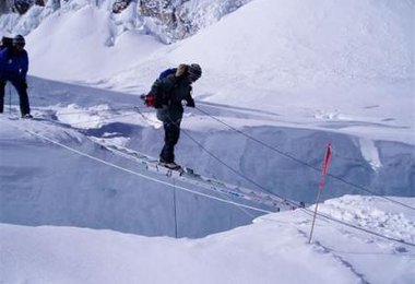 Wir stiegen frohen Mutes am Samstag den 15. Mai vom Basislager durch den gefürchteten Khumbueisbruch ins Camp 2. Mittlerweile kannten wir die verschiedenen Leitern ja schon gut genug und waren auch schon sehr gut an die Höhe gewöhnt. So konnten wir bereits gegen Mittag unser Lunch bei unserem Koch Mingma in Camp 2 einnehmen.
