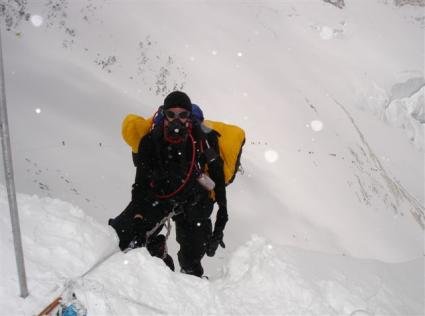 Wieder tauschten wir unsere Sauerstoffflaschen und stiegen die steile, relativ lange Triangelwand hinunter zum Südcol in unser Camp 4. Am frühen Nachmittag änderte sich das Wetter schlagartig. Heftige Windböen schüttelten die Zelte und wir waren wirklich froh, nicht in diesen starken Wind hinaus zu müssen.