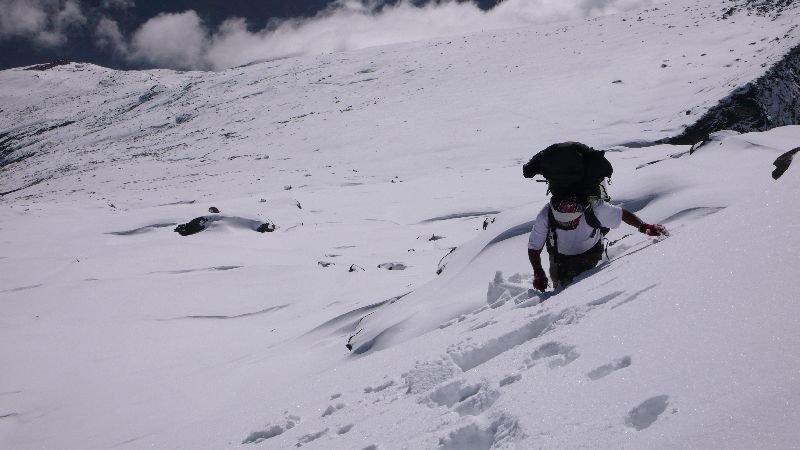 Der ursprüngliche Plan am unbegangenen Kongde Ri Ost-Pfeiler zumindest ein paar Meter nach oben klettern zu können, mußte ich gemeinsam mit meinem Kletterpartner Chuldim Sherpa ziemlich schnell begraben. Hüfthoher Neuschnee an den niedrigeren Bergen vor dem Himalaya Hauptkamm ließen uns noch nicht mal zum Einstieg der Kletterei kommen. Die geplante Akklimatisation wäre hinfällig gewesen und so hatte ich mich schnell zu einem Ausweichtrekking in höhere Lagen des Everest-Gebiets entschieden.
