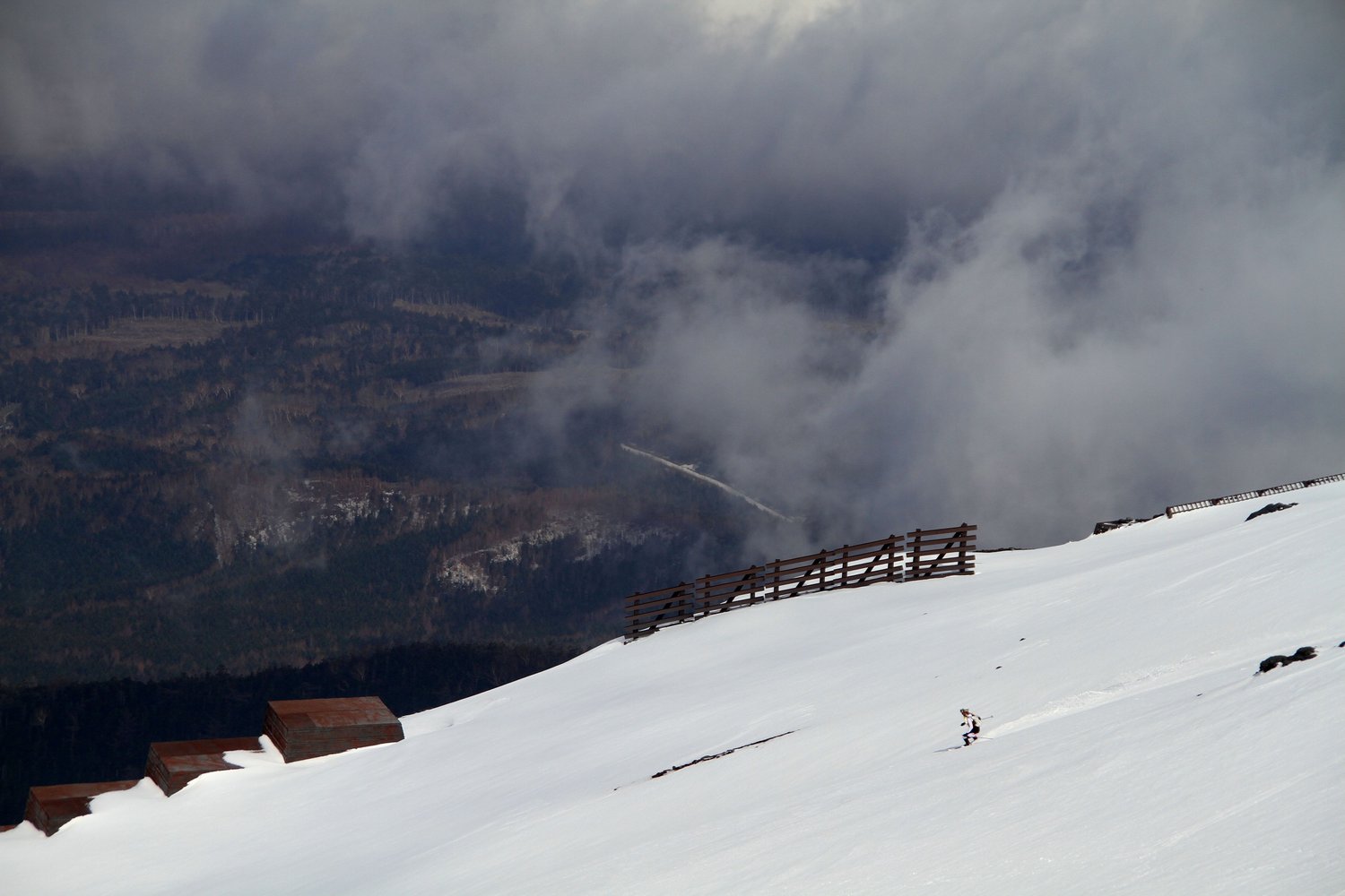 Die ersten sieben Kilometer läuft der Skitourenathlet mit Ski und Skischuhen auf dem Rücken bis zum Parkplatz Uma Gaeshi auf 1.490 Meter. Ab Uma Gaeshi geht es auf einem matschigen Trail zu Fuß weiter durch dichten Wald bis auf 1.840 Meter. Ab dieser Höhe beginnt die Begehung auf Ski und Benedikt Böhm bewältigt den teils vereisten Pfad bis ans Ende der Baumgrenze mit erstmalig freien Blick auf das großzügige weiße Gipfelplateau. Die Konditionen und das Wetter sind gut, nur im Gipfelbereich herrscht ein sehr strenger und kalter Wind. Ab einer Höhe von 2.900 Metern geht es nur mehr mit Steigeisen voran und eine Eispiste auf den letzten 600 Metern machen eine Abfahrt unmöglich.