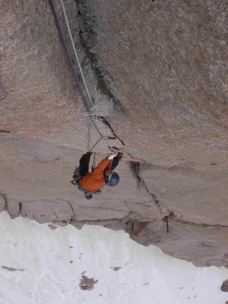 Nach vier schönen einfacheren Längen beginnt die eigentlichen Headwall. 20 m kompakter, steiler Granit trennten uns vom perfekten Riss, der bis unter den Gandel (Kopf auf Balti) hochzieht.