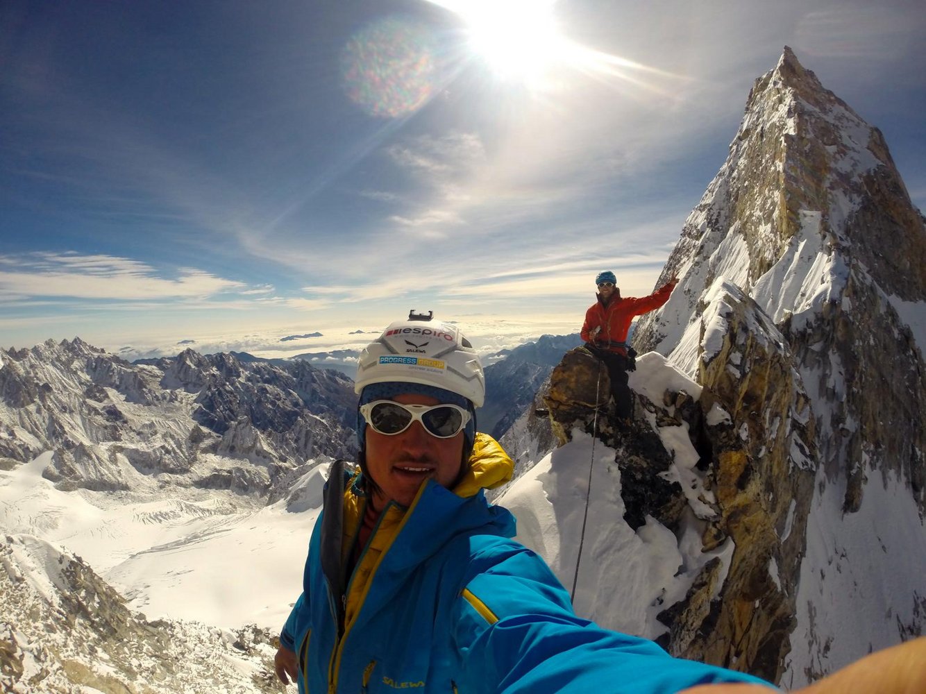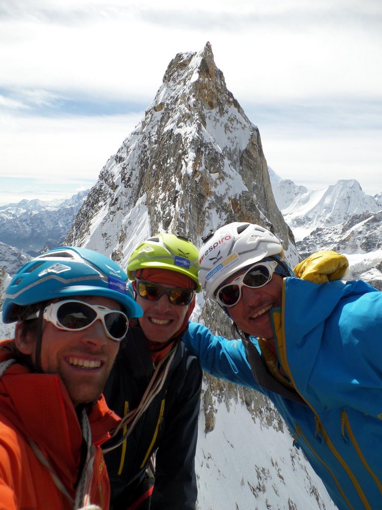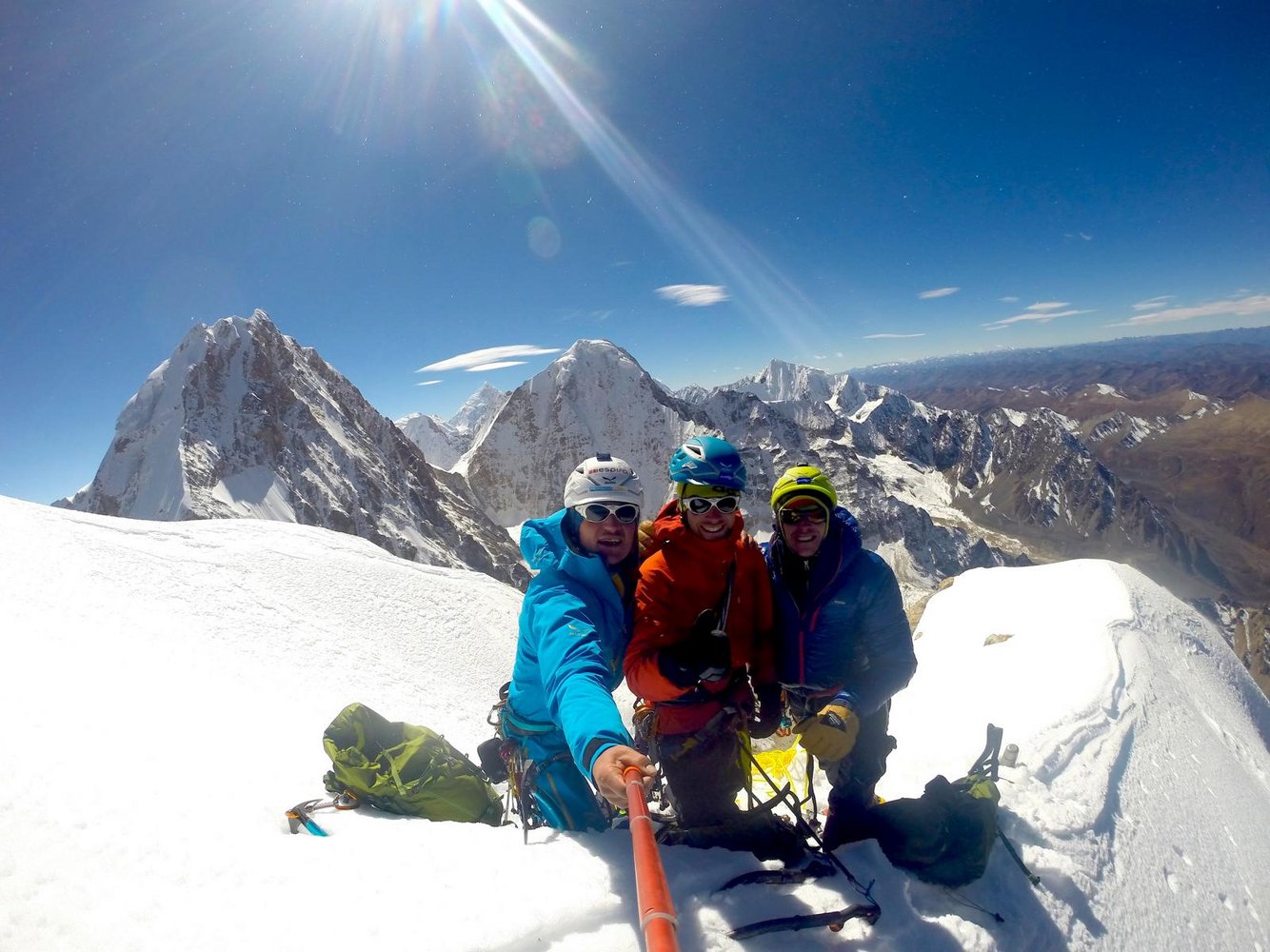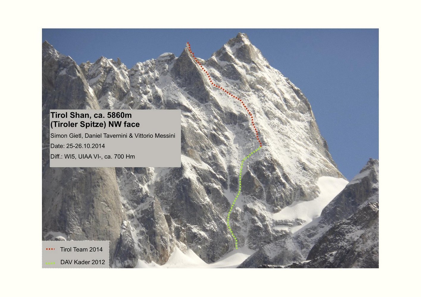 Das Wetter sollte zwar kalt, aber immer noch ein Tag schön bleiben, somit disponierten sie auf eine kombinierte Linie weiter rechts um. Das neue Ziel hieß nun der noch unbestiegene Spitz zwischen der „Stiffler's Mum“ und dem „Melcyr Shan“. Am gleichen Tag wurde dann noch zum Einstieg gespurt und die erste Eislänge eingehängt (die ersten 6 Seillängen der vorgenommenen Linie wurden bereits 2012 vom DAV Exped Kader erstbegangen). Am nächsten Tag hieß es wieder früh aufstehen und nachdem über Nacht der Wind die Spur wieder zugeweht hatte, musste Simon bis zum Einstieg wieder alles neu spuren. Dann war Vitto an der Reihe und kletterte die unteren steilen Eislängen, wobei die steilste davon (ca. WI5) ziemlich dünn war und hohl klang, was aber durch ein paar Cams auf der Seite im Fels „entschärft“ werden konnte. Als die Sonne dann aufging, übernahm Simon wiederum die Führung und 50° - 60° steiles Schnee/Eisgelände leitete bis auf die ausgesetzte Scharte zwischen dem „Melcyr Shan“ und den noch unbestiegenen Spitz. Die letzten 40 Meter schauten nochmals richtig gut aus. Sonne, kein Wind, schöner Granit und ein noch unbestiegener Berg! Viel mehr kann man sich als Geburtstagskind ja nicht wünschen, also war Daniel an der Reihe, der souverän die 5er Länge vorstieg. Die letzten 10 Meter riss nochmal Simon kräftig über die ausgesetzte Kante und dann standen die drei Tiroler auf dem nun erstbegangen Gipfel oben. „Tirol Shan“, also Tiroler Spitze sollte diese äußerst formschöne, ca. 5860 m hohe Granitnadel genannt werden. Fotos lügen nicht – richtige Freude stand den drei Jungs groß ins Gesicht geschrieen, über die wunderschöne gelungene Tour! Nach dem Abseilen folgte dann der lange Abstieg, der bis ins Basislanger ging, denn am Folgetag sollte es wieder stürmen.