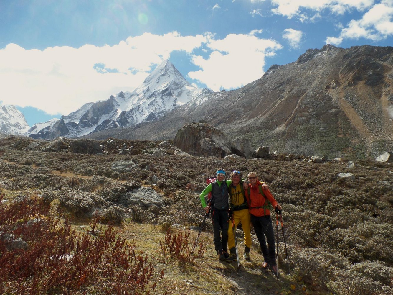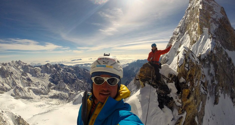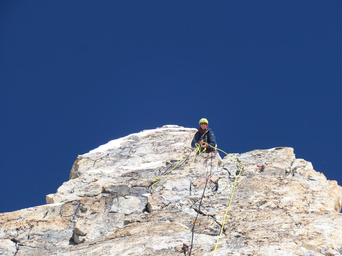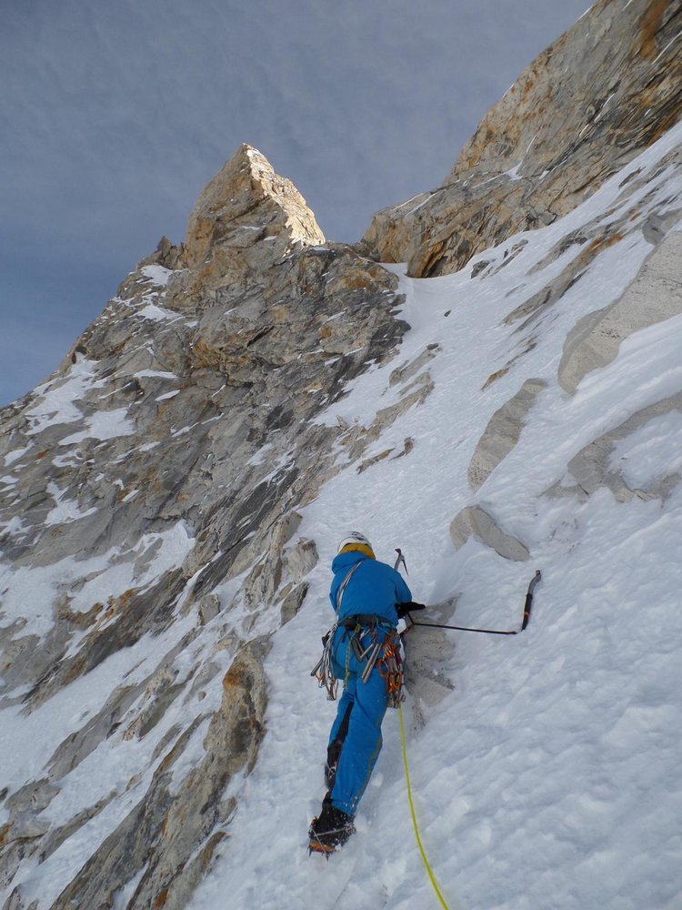 Das Wetter sollte zwar kalt, aber immer noch ein Tag schön bleiben, somit disponierten sie auf eine kombinierte Linie weiter rechts um. Das neue Ziel hieß nun der noch unbestiegene Spitz zwischen der „Stiffler's Mum“ und dem „Melcyr Shan“. Am gleichen Tag wurde dann noch zum Einstieg gespurt und die erste Eislänge eingehängt (die ersten 6 Seillängen der vorgenommenen Linie wurden bereits 2012 vom DAV Exped Kader erstbegangen). Am nächsten Tag hieß es wieder früh aufstehen und nachdem über Nacht der Wind die Spur wieder zugeweht hatte, musste Simon bis zum Einstieg wieder alles neu spuren. Dann war Vitto an der Reihe und kletterte die unteren steilen Eislängen, wobei die steilste davon (ca. WI5) ziemlich dünn war und hohl klang, was aber durch ein paar Cams auf der Seite im Fels „entschärft“ werden konnte. Als die Sonne dann aufging, übernahm Simon wiederum die Führung und 50° - 60° steiles Schnee/Eisgelände leitete bis auf die ausgesetzte Scharte zwischen dem „Melcyr Shan“ und den noch unbestiegenen Spitz. Die letzten 40 Meter schauten nochmals richtig gut aus. Sonne, kein Wind, schöner Granit und ein noch unbestiegener Berg! Viel mehr kann man sich als Geburtstagskind ja nicht wünschen, also war Daniel an der Reihe, der souverän die 5er Länge vorstieg. Die letzten 10 Meter riss nochmal Simon kräftig über die ausgesetzte Kante und dann standen die drei Tiroler auf dem nun erstbegangen Gipfel oben. „Tirol Shan“, also Tiroler Spitze sollte diese äußerst formschöne, ca. 5860 m hohe Granitnadel genannt werden. Fotos lügen nicht – richtige Freude stand den drei Jungs groß ins Gesicht geschrieen, über die wunderschöne gelungene Tour! Nach dem Abseilen folgte dann der lange Abstieg, der bis ins Basislanger ging, denn am Folgetag sollte es wieder stürmen.