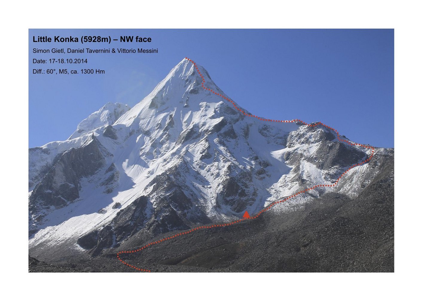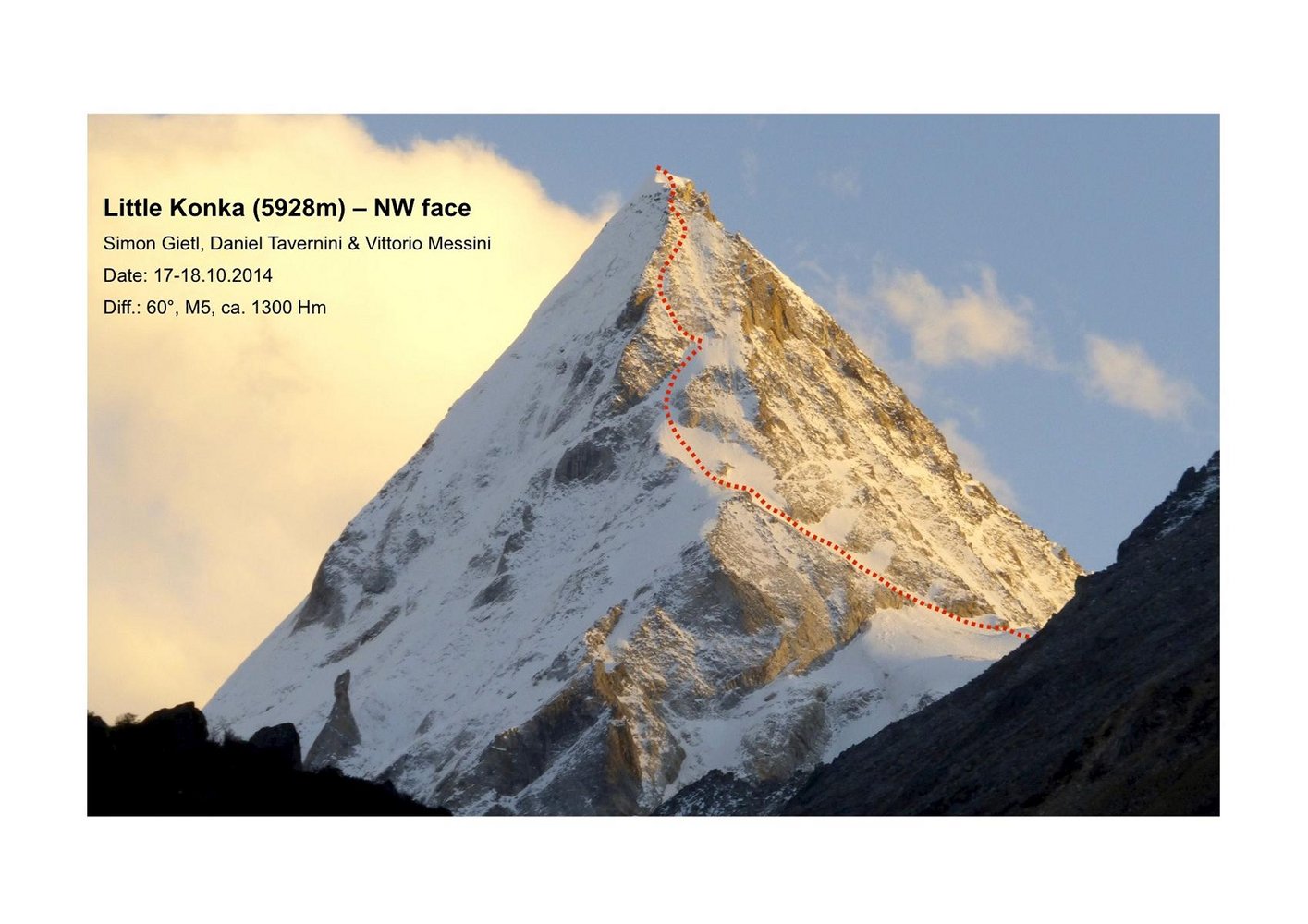 Nach zwei Tage Bouldern und Materialtransport, starteten dann Simon Daniel und Vitto am 17ten Oktober für den „Little Konka“. Auf ca. 4600 m wurde das Zelt aufgestellt. Am Abend zog dann wieder Nebel ins Tal hinein, doch diesmal waren wir darüber und genoßen es in vollen Zügen. Die Aufstiegslinie für den nächsten Tag hatten nach unzähligen Blicke in die Nordwestseite alle drei genau im Kopf, trotzdem waren alle gespannt auf das was kommen würde. Der Wecker läutete und um 4:00 Uhr ging es dann los. Die ersten 1,5 Stunden ging es mehr oder weniger über Blockgelände rauf bis zum nach Nordwesten verlaufenden Grat. Hier wurde es dann steiler und der Wind auch stärker – Zeit das Seil auszupacken. Simon stieg drei kurze Längen vor, bis sie das kleine Plateau vor der Nordwestseite des „Little Konka“ erreichten. Leichter wäre es hier einfach über die erste Gletscherfläche raufzuspuren, doch der Hang darüber scheint ihnen sehr mit Triebschnee geladen zu sein, also zieht es den drei Bergsteigern auf den rechts davon hinaufführenden Grat. Drei gar nicht so leichte und brüchige Längen leiten dann auf das obere Plateau, wo es dann aber „richtig“ losgeht. Anfänglich noch über Schigelände hinaufsteigend, wurde der Hang immer steiler bis er eine Neigung von ca. 60° erreichte. Die Sonne war bereits aufgegangen, doch der Wind blies immer noch so stark wie zuvor. Die Höhe machte sich auch schon eine Weile bemerkbar, doch Simon schien es nicht allzu viel auszumachen und spurte fast immer voran. Nach einigen Stunden waren sie dann fast am Ausstiegsgrat angelangt, wo dann wegen der Müdigkeit und ein, zwei etwas heikler Stellen nochmals eingeseilt wurde. Einen letzten steilen überwächteten Grat galt es noch zu überwinden und um ca. 13:00 Uhr standen sie dann oben auf ihren ersten chinesischen Gipfel, den 5928 m hohen „Little Konka“, einfach geil! Von allen Seiten wurden mehrere Fotos gemacht, bis der Abstieg in Angriff genommen wurde. Über die Aufstiegsroute wurde abgeseilt und am Abend sind sie wieder beim Zelt retour. Ob es nun eine Erstbegehung war oder nicht wird nur vermutet, da drei Stände gefunden werden konnten. Nach längerer Recherche gehören diese vermutlich einer koreanischen Expedition, die etwas weiter rechts, die Westwand erstbegangen hat und über die einladendere Nordwestseite abgeseilt ist. Erstbegehung hin oder her, am nächsten Tag stiegen die drei Kollegen ins Basislager ab und es wurde dann erstmal gescheid gefeiert.
