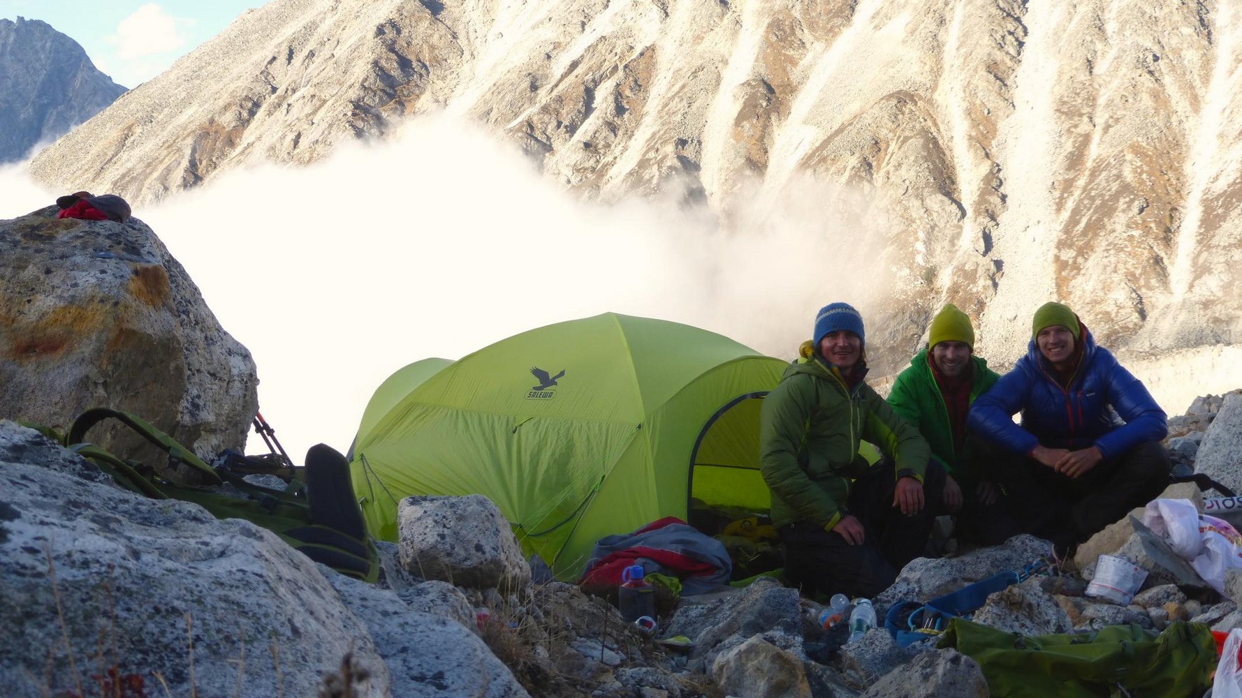 Am 23ten Oktober starteten die drei Bergsteiger dann Richtung Hochlager, welches sie im Kessel zwischen „Stiffler's Mum“, „Jazi“ und „Little Konka“, auf einer Höhe von ca. 4950 m aufschlugen. Das Wetter sollte für einige Tage mitspielen, somit wurde genügend Essen und Gas mitgenommen. Allerdings fielen über Nacht 20 cm Schnee und der Traum als erste den 800 m hohen Granitpfeiler der „Stiffler's Mum“ zu klettern schien zu platzen. 2010 hatten bereits Franzosen daran probiert, allerdings aber nach 8 Seillängen wegen unglücklicher Umstände umdrehen müssen. Die drei Tiroler stiegen weiter rechts als die Franzosen ein, wo ihnen der Schnee einmal nicht viel anhaben konnte, denn nach einem Eisgully folgte eine Schnee/Eisrampe, die in einer Rechtsschleife auf die Nordwestkante des Pfeilers führte. Die ersten 4 Seillängen wurden somit fixiert und ins Hochlager abgestiegen. Was aber schon vom Zelt aus sichtbar war, ist das was nach der vierten Seillänge folgen würde, viel angenehmer und zeitsparender ohne Schnee und Eis zu klettern ginge. „Warten wir noch eine Nacht ab, morden werden wir dann entscheiden...“ dachten sie sich. Es folgte wie erwünscht eine sternenklare Nacht, aber die Temperatur fiel über Nacht auf ca. -15°C! Viel zu tief für Kletterpatschen... Dazu kam noch, dass der Pfeiler westseitig, bzw. die vorgenommene Linie nordwestseitig ist. Auch wenn der Schnee schmelzen sollte, würde die Sonne nur nachmittags kletterfreundliche Bedingungen schaffen können... Nach langem Überlegen wurde für das „Abpacken“ vom Pfeiler entschieden und das am Vortag verlegte Fixseil entfernt.