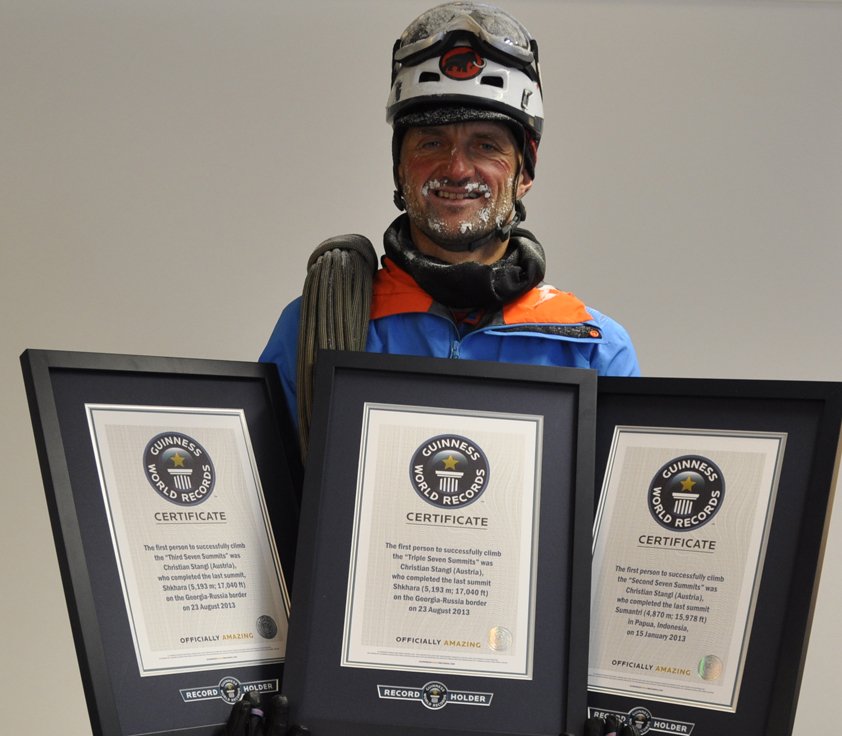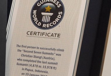 Christian Stangl hat wie schon von uns berichtet sein Projekt der "Triple Seven Summits" mit der Besteigung des "Shkhara" im Kaukasus abgeschlossen und hat auf dem Gipfel - ähnlich wie Fußballprofi David Alaba - Gott gedankt. Um es aber amtlich zu machen, dass er der wirklich erster Besteiger der Triple Seven Summits ist hat er sich dies vom Guinness Book of World Records in London bestätigen lassen.