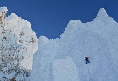 Am Cerro Torre versuchten sich die Bergsteiger an der Ferrari - Route. Doch hundertfünfzig Meter unter dem Gipfel war Endstation! Die drei fanden sich in gefährlichen Eisformationen wieder. Zu gefährlich -die Gruppe entschied sich für den Rückzug. Dani Arnold: "Es ist schwierig diese Gebilde von Eis und Schnee zu beschreiben. Die Dinger waren einfach riesig. Sie hingen wie große Dächer und Überhänge über unseren Köpfen. An diesen Teilen zu klettern wä r e zu heikel gewesen.“
