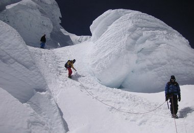 Der nächste 6000er, diesmal aber in der Cordillera Blanca im Norden von Peru gelegen. Der „Chopicalqui“ mit fast 6500 m. Der Berg, ein riesiger Eisklotz, der 2 Lager am Berg verlangt, wobei diesmal das Hochlager auf 5450 m liegt.