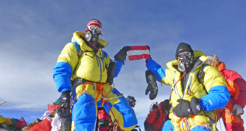 Gipfelfoto von zwei österreichischen Flash Teilnehmern (Reinhold und Philip Pucher aus der Steiermark). (Foto: Furtenbach Adventures)