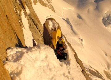 Die extrem anspruchsvolle Route folgt am Anfang der Williams Rampe bis sie dann senkrecht in die große Wand der Poincenot führt. Drei kombinierte Seillängen führen auf die exponierte Kanzel, wo das Zelt der beiden Athleten gerade so Platz findet. Für den Schweizer Roger der schönste, aber auch windigste Biwakplatz seines Lebens.