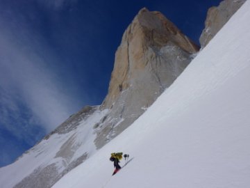 Der Abstieg bietet noch einmal einiges an Spannung, da die unbekannte "Franco Argentina" Route viele Tücken bereit hält. Pünktlich zum Sonnenuntergang erreichen sie das Biwak. Am nächsten Morgen schafften sie noch fast einen Speedrekord im Absteigen. Nicht aus Motivation oder Ehrgeiz. Wieder einmal gejagt durch das Wetter.