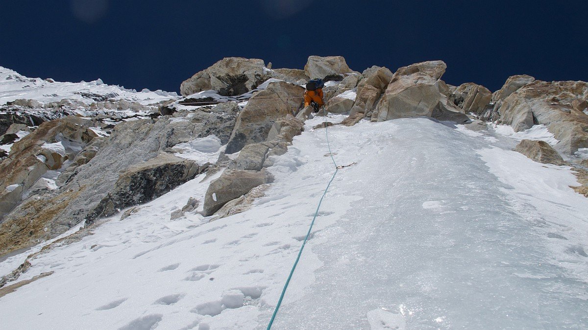Kurz vor den ersten Sonnenstrahlen, um 6.15 Uhr, brachen wir bei eisigen Temperaturen auf. Wieder am laufenden Seil versuchten wir die bestmögliche Linie durch Fels, Schnee und Eis nach oben zu finden.