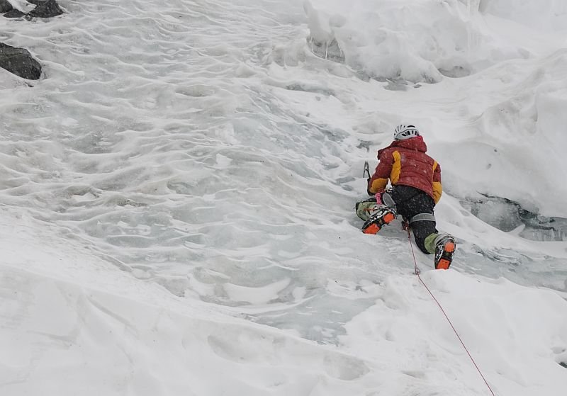 Danach einige Meter senkrecht hinauf, die zum Teil 20cm dicke Schneeauflage ist nicht wirklich mit dem Eis verbunden, dementsprechend schlecht der Halt der Eisgeräte. Danach legt sich das Gelände etwas zurück, in dem sehr harten Eis erweist sich aber auch hier das Setzen der Eisschrauben als sehr mühsam. Danach abseilen. Gut, nun wissen wir ein bisschen mehr. Ralf meinte, nun haben wir dem Everest gerade mal am Hintern gekitzelt. Immerhin schon was. ?