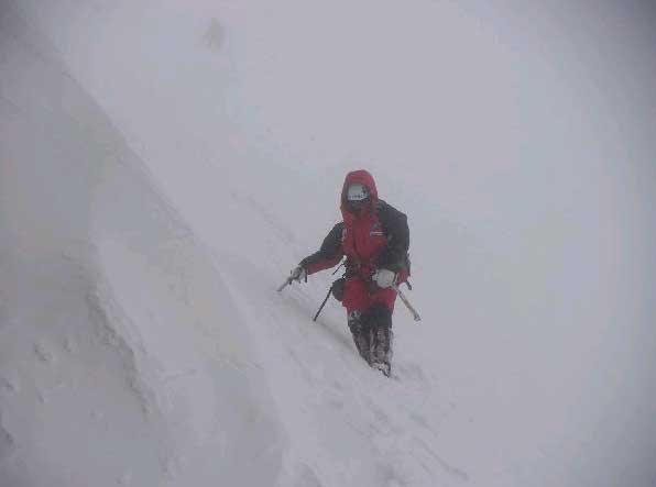 200 Höhenmeter unterhalb unseres Tagesziels waren wir hängen geblieben. Der nächste Morgen gibt uns die Chance ein wenig aufzuholen. Kurze senkrechte Eispassagen führen uns zum lange erwarteten Felsriegel. Nicht sehr verlockend, - stark verschneit, nahezu senkrecht und übel brüchig. Aber es geht. Seillänge um Seillänge kommen wir nach oben. Kommentar Gerlinde: ".. das Brüchigste, was ich je geklettert bin." Nach einer flacheren Seilänge sind wir in der 800 Meter hohen Gipfeleisrinne. Der wir noch 100 Höhenmeter folgen, dann ist bei stärker werdendem Schneetreiben wieder frühzeitig Schluss. Die ersten Neuschneelawinen rutschen die Eisrinne hinunter als wir seitlich am Grat wieder die Möglichkeit für einen Biwakplatz finden.