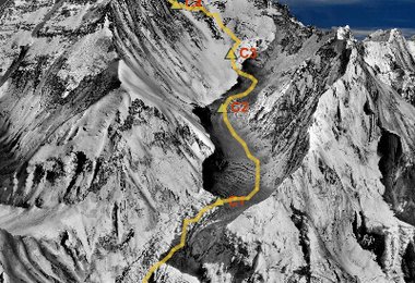 Der Abstieg gestaltet sich dann - wie üblich auf hohen Bergen – verblüffend viel einfacher und kraftsparender als erwartet. Bald sind wir am Südgipfel, bei herrlichem Sonnenschein, jedoch bitterer Kälte. Rasch kommen wir tiefer und fotografieren noch einige Bergsteiger im Aufstieg, bevor wir am Balkon noch eine große Pause einlegen. Hier werden die Sauerstoffflaschen gewechselt und dann geht es noch die unangenehme Triangle Wall entlang der Fixseile hinunter in unser Camp 4 am Südcol.