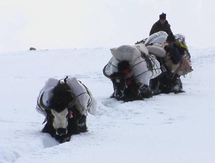 Tatsächlich kamen wir zunächst mit unseren 16 Yaks die ersten paar Kilometer noch einigermassen gut voran. Mit zunehmender Höhe aber wurde der Schnee immer tiefer. Mit gegen Mittag aufkommendem Schlechtwetter waren wir bald in geschlossenen Schneedecke unterwegs, die Yaks brachen immer wieder bis zum Bauch ein. Nur mit viel Mühe konnten die Yaktreiber ihre Tiere zum Weitergehen bewegen. Nach zehn langen Stunden hatten wir mit Einbruch der Dunkelheit noch lange nicht das eigentliche Zwischenlager erreicht. Dem Wind sehr ausgesetzt richteten wir uns auf einem etwas abgeblasenen Moränenrücken sehr notdürftig für die Nacht ein. Da es kein fliessendes Wasser gab, mussten wir sowohl für uns als auch für unsere Yaktreiber Schnee schmelzen.