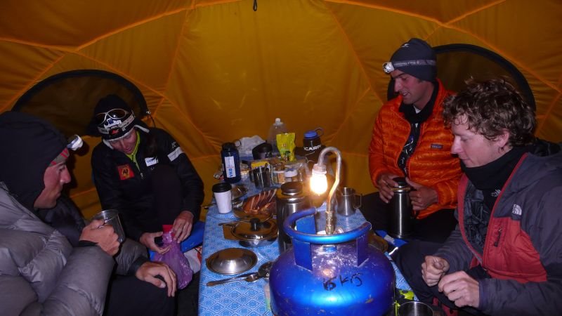 01:00 Uhr Fabrizio Zangrillie kommt zum Frühstück herüber. Seit Tagen haben wir guten Kontakt zu ihm, - er möchte sich Gerlinde, David und Daniel anschließen. Fabrizio kenne ich vom Klettern in Queen Maud Land, - ein wirklich fitter und flotter Amerikaner. Das Frühstück läuft fast entspannt - ein wenig Nervosität ist trotzdem zu spüren.