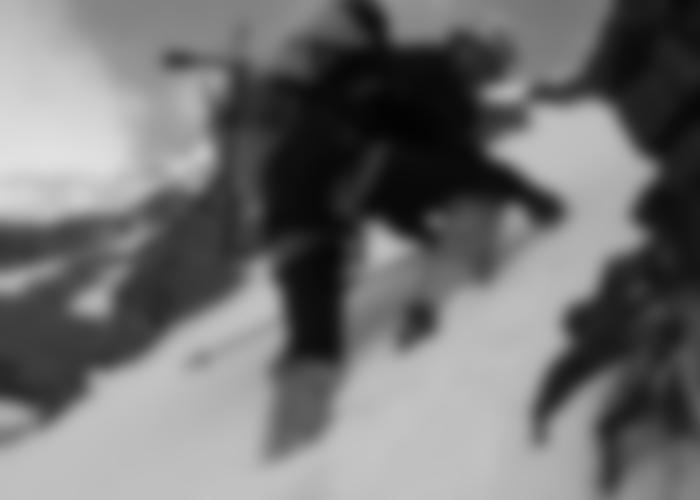 Alle anderen zunächst mit aufsteigenden Bergsteiger darunter Gerfried Göschl und Christian Stangl aus Österreich sind bereits im Abstieg.