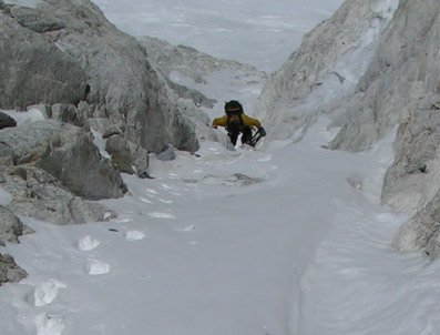 Der Abstieg am nächsten Tag wurde noch einmal zur Tortur. Durch die Wärme der vorangegangenen Tage waren die Eisschrauben an den Standplätzen ausgeapert und auf dem Gletscher versanken wir teilweise bis zur Brust im Schnee. Am späten Nachmittag erreichten wir endlich das Basislager und waren froh, alles heil überstanden zu haben.