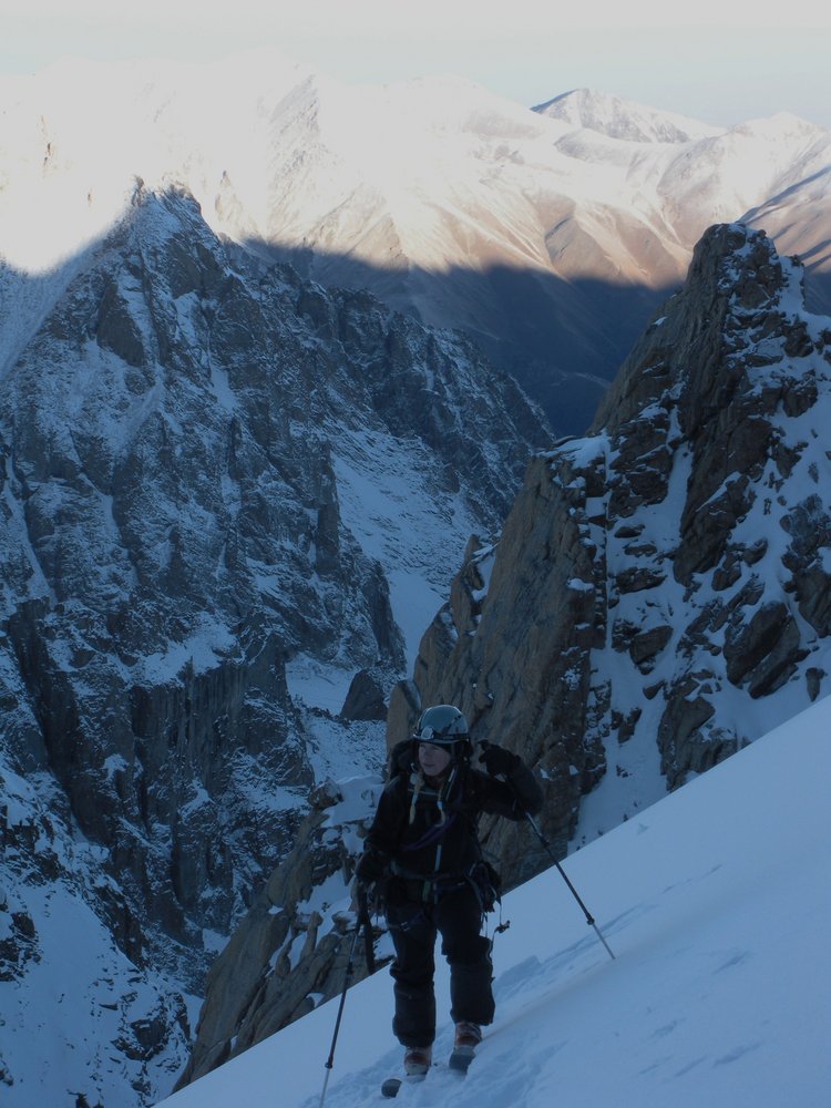 Der Aufstieg nahm ca. 5 Stunden in Anspruch. Und obwohl sich am Himmel bereits die Sonne zeigte, lag der gesamte Aufstiegsweg, der durch einen Westhang führte, stets im Schatten. Die große Kälte im Schatten machte mir bei meinen alten Erfrierungen an den Füßen zu schaffen und so beschloss ich, die Tour auf 4600 m beim ersten Gratturm zu beenden. Zum Gipfel fehlten noch der Felsgrat über den zweiten Turm mit 200 Hm , doch ich habe mich hier für meine Gesundheit und gegen den Gipfel entschieden.