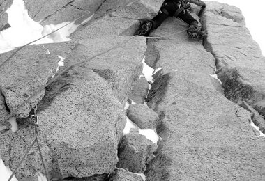 Dann beginnt die Kletterei im Fels, der jedoch immer wieder mit Eis und Schnee durchsetzt ist. So lohnt es sich nicht, die Steigeisen abzulegen. Auf kleinen Felsleisten steht man auch mit den beiden vorderen Zacken der Steigeisen ganz ordentlich, während man auf glatten Felsplatten gegenüber Berg- oder gar Kletterschuhen klar im Nachteil ist.