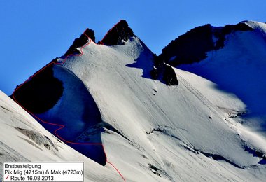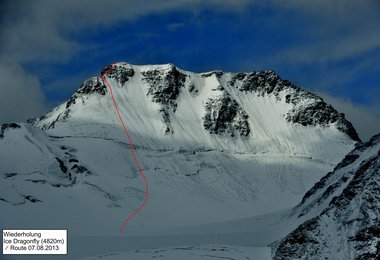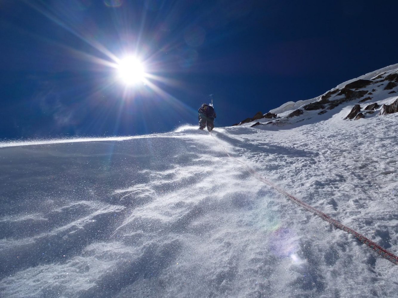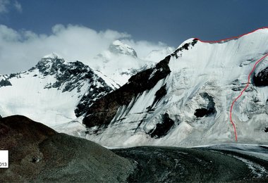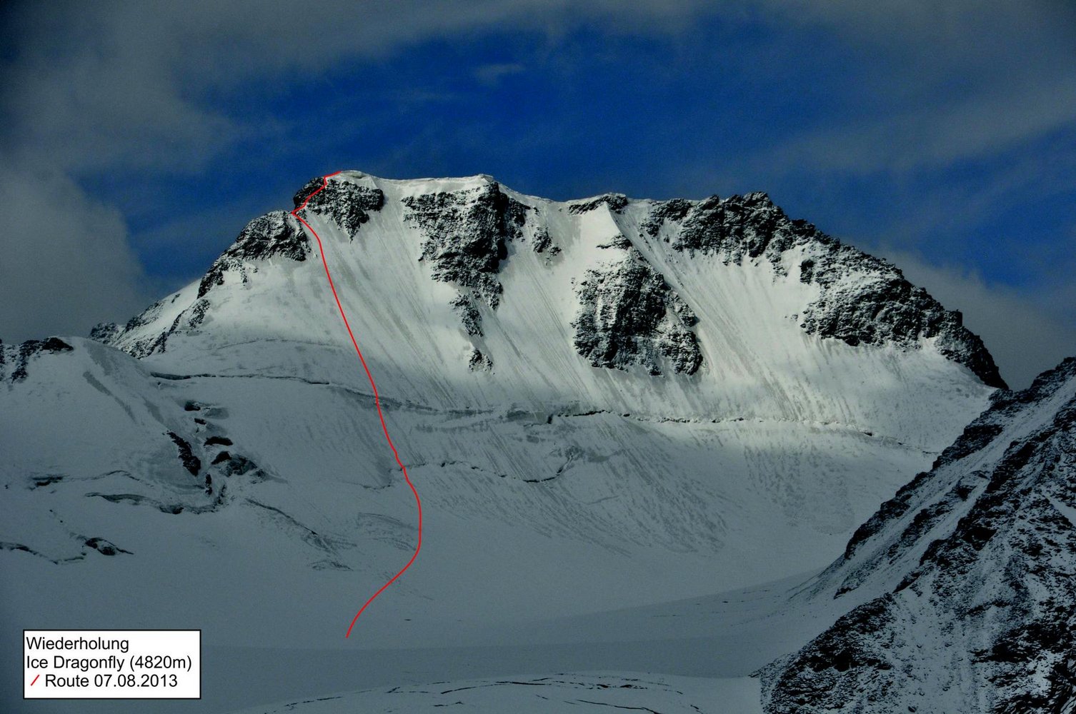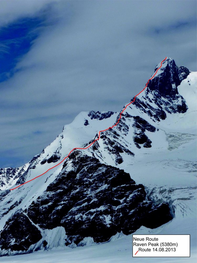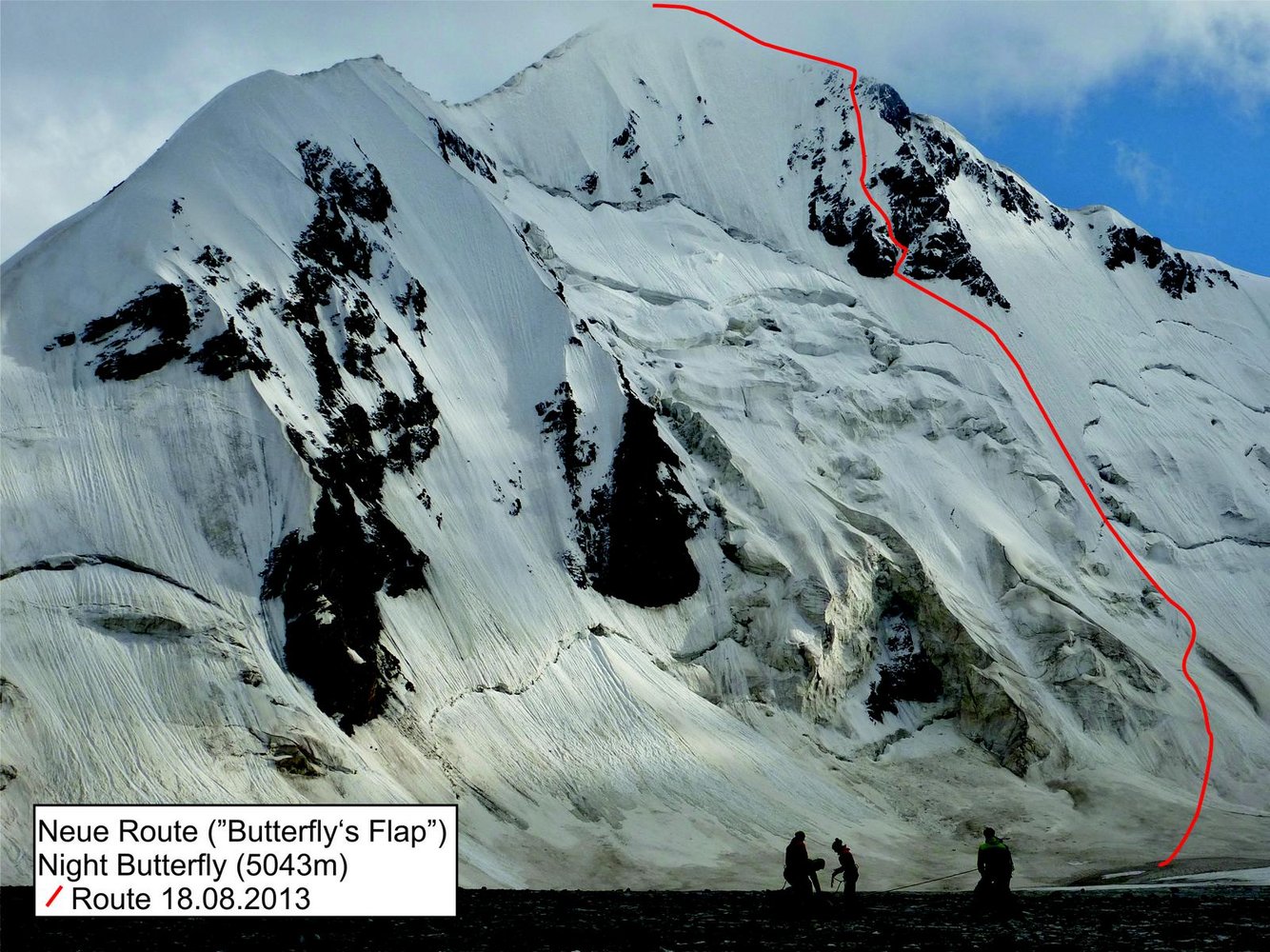 Nach der ‚Eingehtour‘ durch die Nordwand des Pony (4705m) schlägt das Wetter um und zwingt uns 4 Tage lang in unsere Zelte. Generell ist das Wetter sehr wechselhaft und teilweise gewittrig und zum Ende hin immer winterlicher. Dennoch gelingen uns 8 Gipfelerfolge, wobei jede Linie für sich eine Herausforderung darstellt. Besonders der erstmalige Durchstieg des Westgrates auf den Raven Peak, der mit rund 5400m auch unseren höchsten Gipfel darstellt, fordert mit seinem kombinierten Gelände und einer Tourendauer von über 13h unsere gesamte Kraft. Die erfolgreiche Erstbesteigung zweier Felsnadeln, die wir nach zwei guten Freunden Peak Mig und Mak (4715m und 4723m) nennen, stellt ein Highlight unseres Aufenthaltes dar. Am letztmöglichen Tourentag gelingt uns eine neue Route in der 600m hohen Nordwand des Night Butterfly (5044m). Mit nahezu vertikalen Teilabschnitten und einer konstanten Steilheit um die 70°, stellt diese Route Butterfly’s Flap sicherlich den bergsteigerischen Höhenpunkt unserer Expedition dar.