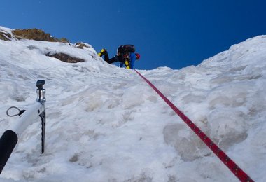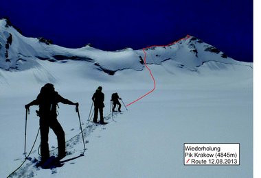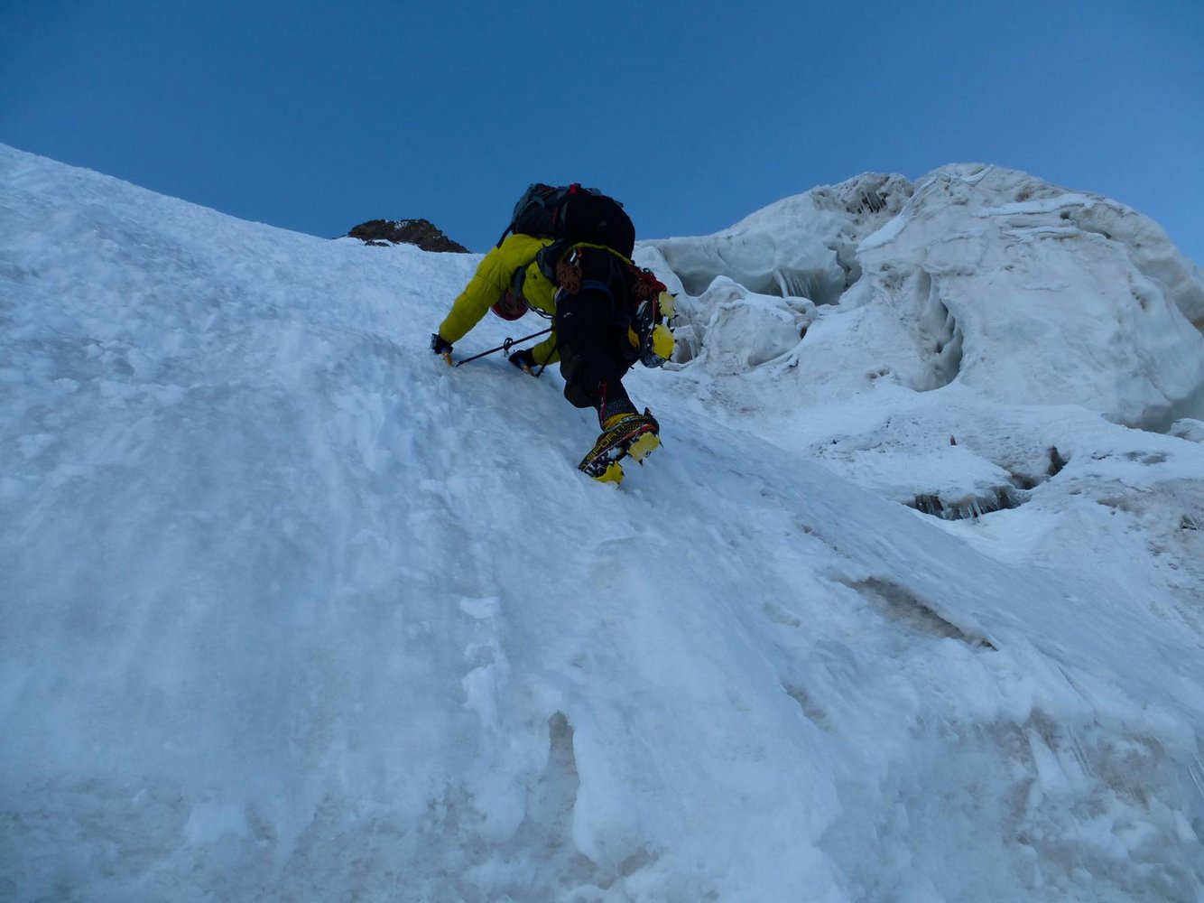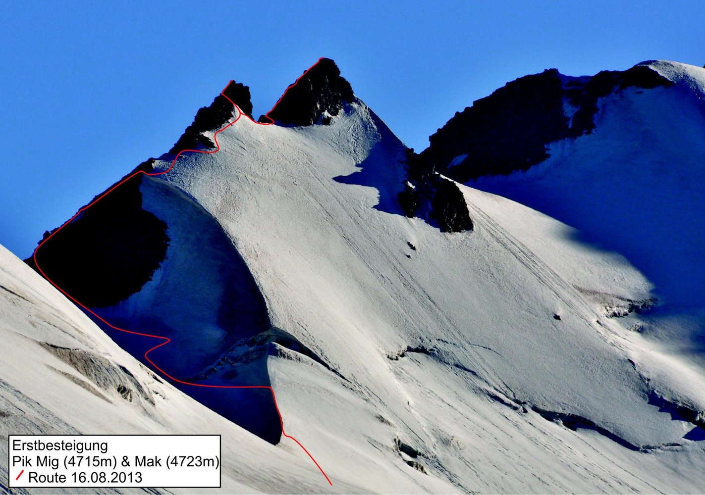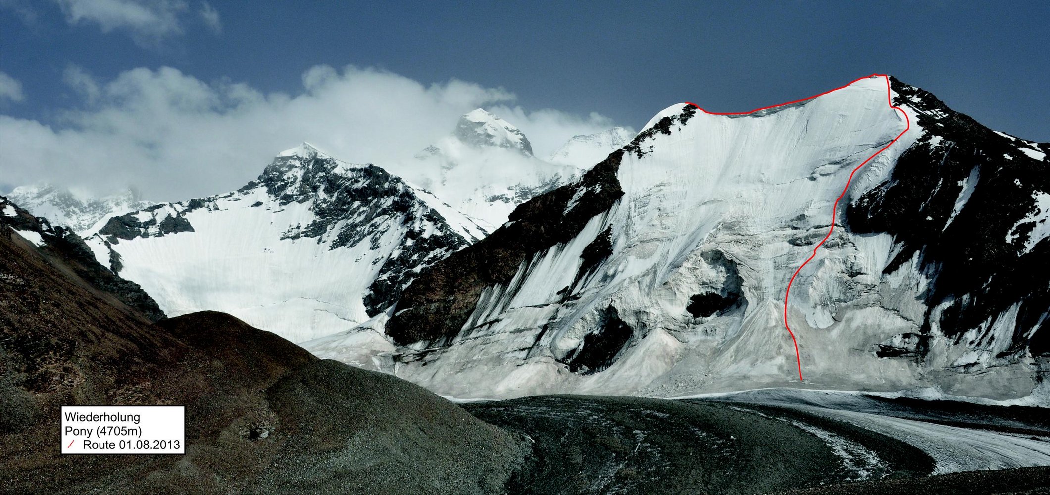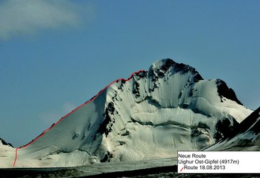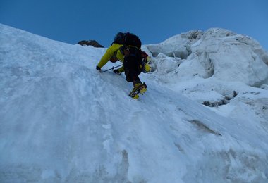 Nach der ‚Eingehtour‘ durch die Nordwand des Pony (4705m) schlägt das Wetter um und zwingt uns 4 Tage lang in unsere Zelte. Generell ist das Wetter sehr wechselhaft und teilweise gewittrig und zum Ende hin immer winterlicher. Dennoch gelingen uns 8 Gipfelerfolge, wobei jede Linie für sich eine Herausforderung darstellt. Besonders der erstmalige Durchstieg des Westgrates auf den Raven Peak, der mit rund 5400m auch unseren höchsten Gipfel darstellt, fordert mit seinem kombinierten Gelände und einer Tourendauer von über 13h unsere gesamte Kraft. Die erfolgreiche Erstbesteigung zweier Felsnadeln, die wir nach zwei guten Freunden Peak Mig und Mak (4715m und 4723m) nennen, stellt ein Highlight unseres Aufenthaltes dar. Am letztmöglichen Tourentag gelingt uns eine neue Route in der 600m hohen Nordwand des Night Butterfly (5044m). Mit nahezu vertikalen Teilabschnitten und einer konstanten Steilheit um die 70°, stellt diese Route Butterfly’s Flap sicherlich den bergsteigerischen Höhenpunkt unserer Expedition dar.