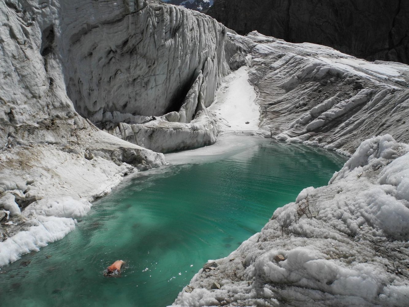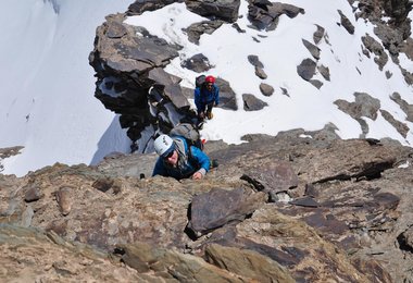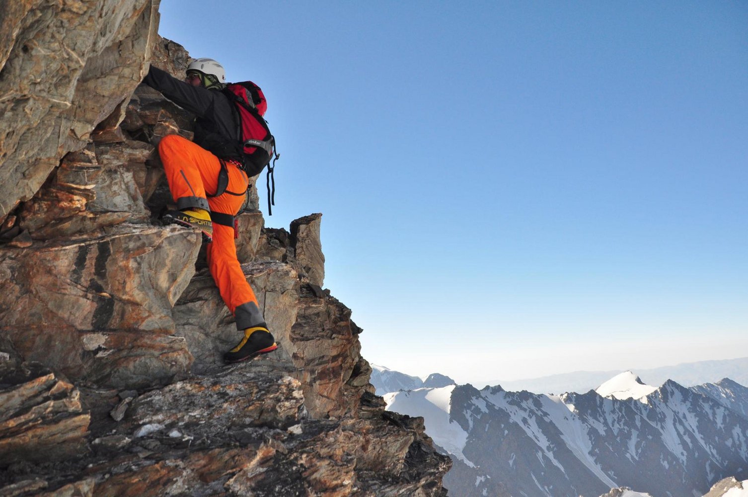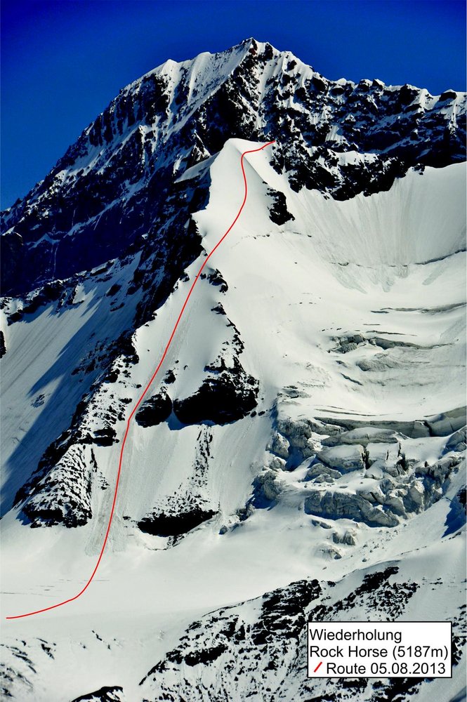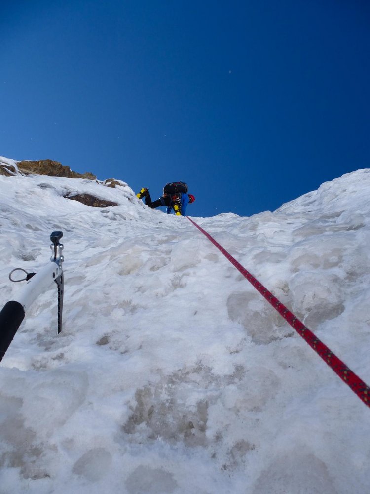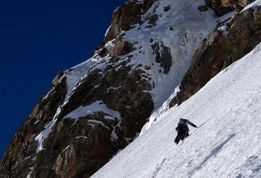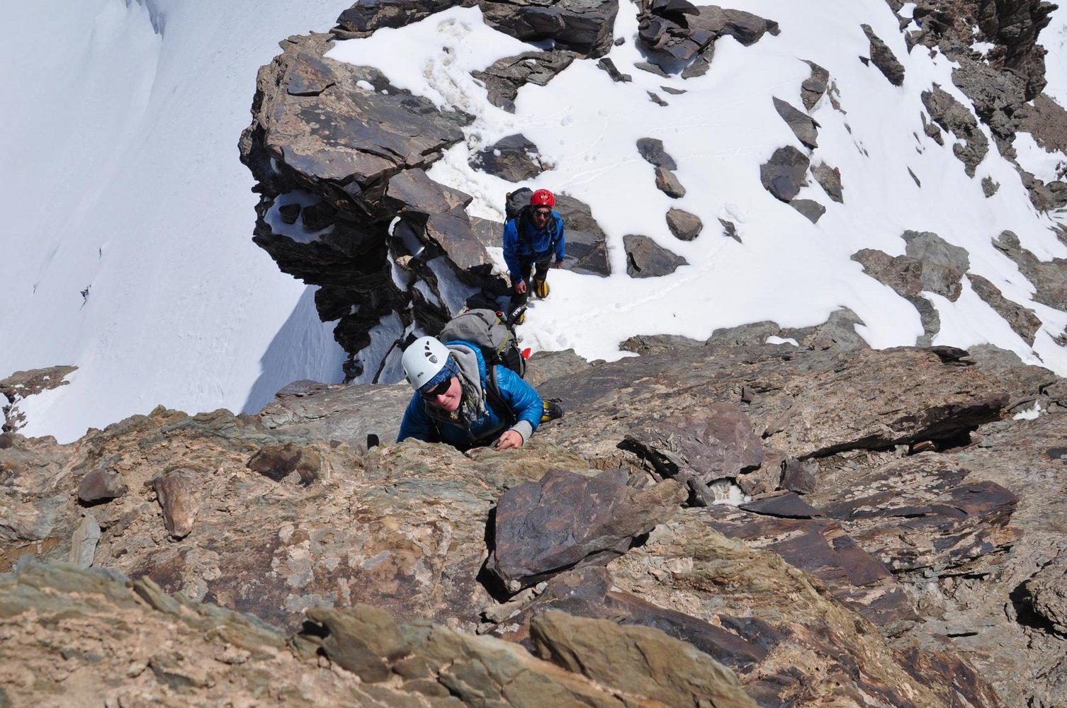 Nach der ‚Eingehtour‘ durch die Nordwand des Pony (4705m) schlägt das Wetter um und zwingt uns 4 Tage lang in unsere Zelte. Generell ist das Wetter sehr wechselhaft und teilweise gewittrig und zum Ende hin immer winterlicher. Dennoch gelingen uns 8 Gipfelerfolge, wobei jede Linie für sich eine Herausforderung darstellt. Besonders der erstmalige Durchstieg des Westgrates auf den Raven Peak, der mit rund 5400m auch unseren höchsten Gipfel darstellt, fordert mit seinem kombinierten Gelände und einer Tourendauer von über 13h unsere gesamte Kraft. Die erfolgreiche Erstbesteigung zweier Felsnadeln, die wir nach zwei guten Freunden Peak Mig und Mak (4715m und 4723m) nennen, stellt ein Highlight unseres Aufenthaltes dar. Am letztmöglichen Tourentag gelingt uns eine neue Route in der 600m hohen Nordwand des Night Butterfly (5044m). Mit nahezu vertikalen Teilabschnitten und einer konstanten Steilheit um die 70°, stellt diese Route Butterfly’s Flap sicherlich den bergsteigerischen Höhenpunkt unserer Expedition dar.
