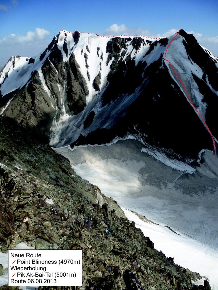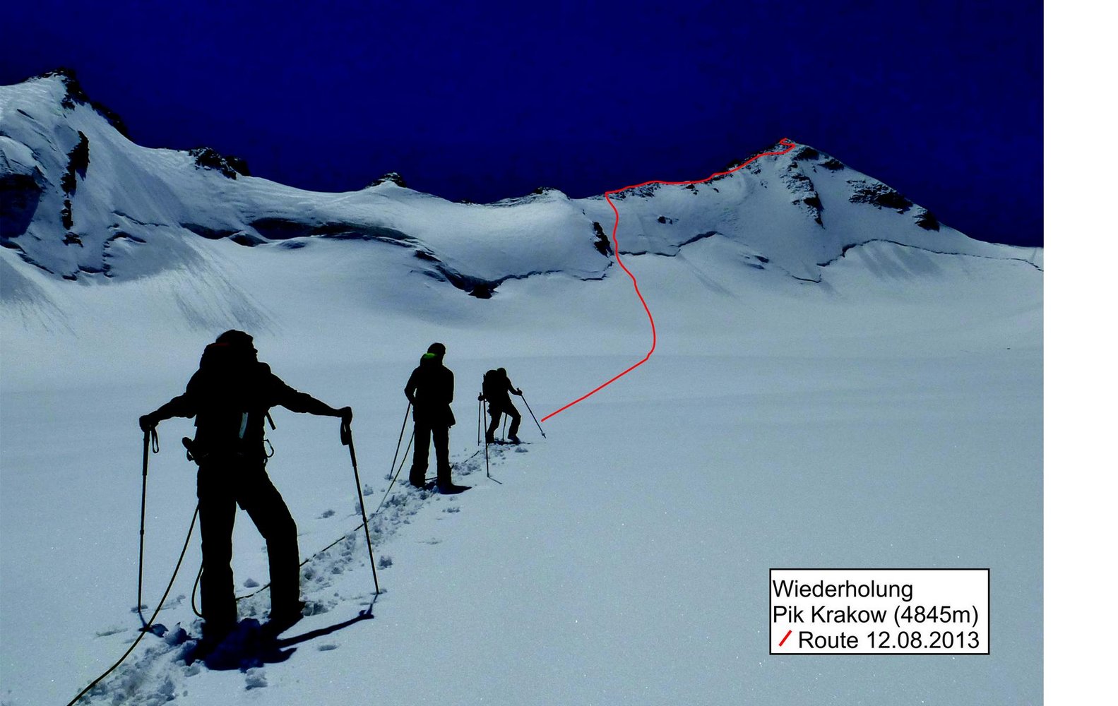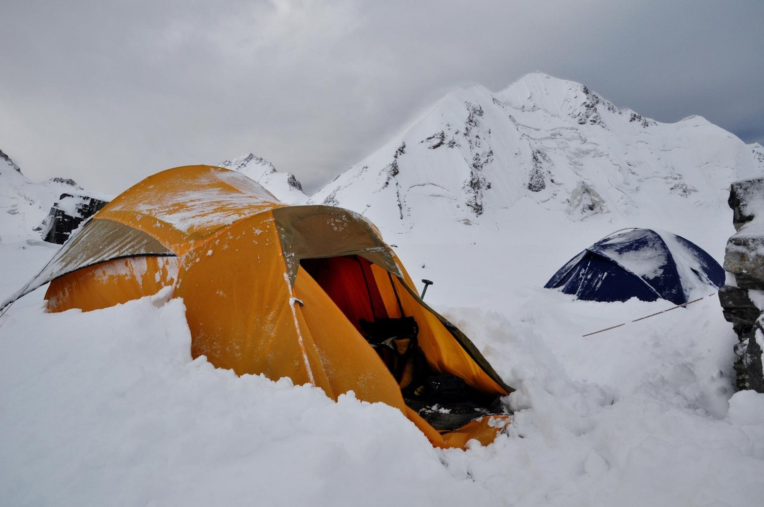 Einige schweißtreibende Tage später steht unser Basecamp 13 Kilometer weiter in 4300m Höhe auf einer Mittelmoräne des Dzhirnahgaktu-Gletschers. Ringsum ragen Berge in allen Formen und Schwierigkeitsgraden auf, nur überragt vom wuchtigen Gipfel des Kizil Asker im Nachbartal, an dessen Wänden sich bereits Ines Papert versucht hat. Unser Plan war es zuerst einige bestehende leichtere Linien zur Akklimatisation zu wiederholen, um uns danach an noch unbestiegenen Bergen und neuen Routen zu versuchen.