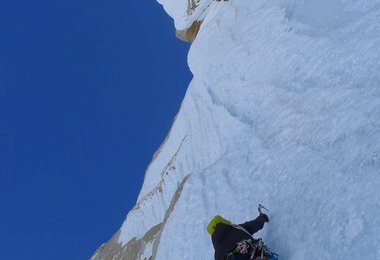 Die Mixed Längen und den ersten Eistunnel bringen wir flott hinter uns, in der sogenannten „Headwall“ eine 90 Grad steile Eiswand, fängt der Wind ordentlich an zu blasen, Patagonien halt; dann geht es flott weiter und bald auch stehen wir unter der letzten und wohl anspruchsvollsten Seillänge. Der Amerikaner Colin Haley hat bei der Überschreitung aller Torres (Standhard, Heron, Egger, und Cerro Torre) für diese eine Seillänge 4 Stunden mit dem Anraum gekämpft und sich seinen Weg/Tunnel nach oben gegraben.