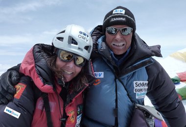 Gerlinde war zum Schluss fast einen Stunde voraus, - sie ist wahnsinnig stark. Und ich konnte es kaum glauben: sie wartete 10 Höhenmeter unter dem Gipfel auf mich, fast eine Stunde lang. Im starken Wind. Bei fast -30°. Um mit mir die letzten Höhenmeter zum Gipfel des Lhotse und damit zu meinem 14. 8000er gemeinsam aufsteigen zu können. Ein unglaublich erhebender Augenblick dort oben gemeinsam ankommen zu dürfen. Und die Ausblicke, die ich mir schon immer ein Mal gewünscht hatte sehen zu können, nun gemeinsam genießen zu können: der filigran überwechtete und mit Eistürmen besetzte Verbindungsgrat von Lhotse zu Nuptse, der schier unwirklich aussehende und !!unmögliche!! Verbindungsgrat zwischen Lhotse und dem Lhotse-Middle. Der um wenige Meter niedrigere, schwarz-rote Gigant Makalu und dahinter ganz im Osten der fünfgipfelige Kangchendzönga. Und 180° weiter – quasi zum Greifen nah: der Everest im Westen.