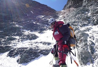 Eine kurze Nacht mit wenig Schlaf, um 4:00 Uhr waren wir im Aufstieg. Über Nacht hatte es etwas Neuschnee gegeben, trotzdem kamen wir gut voran. Während die umliegenden Berge schon bald in der Morgensonne standen, stiegen wir auf der Westseite des Lhotse in einer engen Rinne im Schatten bei -25° auf. Die ehemalige Eisrinne, die wir aus dem Jahr 2006 als solche kannten, ist inzwischen großteils eine steinschlaggefährdete Felsrinne mit spannender Fels- und Mixed-Kletterei. Unglaublich wie sehr sich das in zwei Jahren verändert hat.