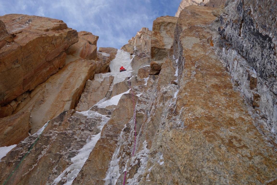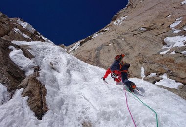 Die beiden Kletterer begannen am 30. September um 5 Uhr morgens mit ihrem Aufstieg. Die ersten paar hundert Meter kletterten sie simultan im Dunkeln. Papert und Lindič wussten, dass sie schnell sein mussten um den Gipfelgrat noch am selben Tag zu erreichen. Sonst würde sich das vorhergesagte Schönwetterfenster schließen und sie müssten ihren Rückzug antreten oder würden in einem Schneesturm gefangen werden. Das Team kam schnell voran und sie kletterten zügig durch riesige Eisdächer. Papert verlor Lindič, der im Vorstieg kletterte, aus ihrem Sichtfeld. Plötzlich hörte sie einen lauten Schrei. Lindič musste vor Freude jubeln als er sah, was vor ihnen lag: perfektes Eis bahnte den Weg bis zum Gipfelgrat. Papert sagte, dass weder sie noch Lindič bisher eine derart vollkommene Eis- und Mixedlinie in dieser Höhe gesehen haben.