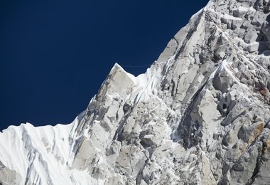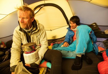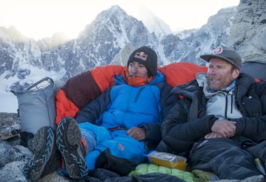 Perfekte Wetterbedingungen bis zur Errichtung des Basislagers und während der Akklimatisierung ließen die Erwartungen des Duos entsprechend steigen. Nach nicht einmal zwei Wochen im Basecamp waren sie bereit für einen Gipfelversuch. „Weil im unteren Bereich der Wand kaum Schnee und Eis zu finden war, was auch die Steinschlaggefahr erheblich vergrösserte, mussten wir von unserer geplanten Aufstiegslinie absehen und eine andere Linie durch sehr viel steileres und schwieriges Gelände wählen.“