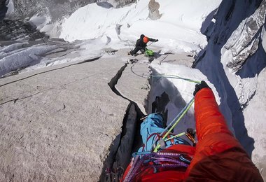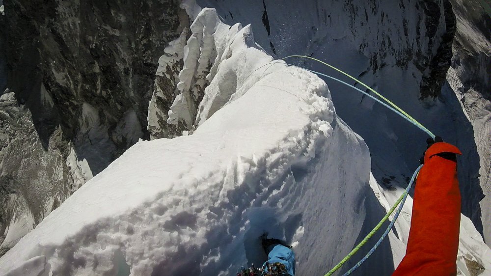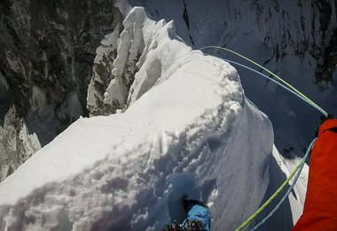 So fasste die österreichisch-amerikanische Seilschaft den Plan, über eine steile Felswand zum Nordwestgrat aufzusteigen, um von dort aus am nächsten Tag einen Gipfelversuch zu starten. Nach anspruchsvoller Kletterei erreichten die beiden am frühen Nachmittag den Grat, der durch schlechte Sicherungsmöglichkeiten und grundlosen Schnee gekennzeichnet war. Die Ausgesetztheit war dafür entsprechend spektakulär. „Die Kletterei war durchwegs anspruchsvoll und komplizierter als wir gedacht hatten. Es gab keine einzige Seillänge, die man einfach raufspaziert.“ so Conrad Anker.