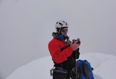 Hans holte einige Steine von einem tiefer gelegenen Gratstück. Es schneite leicht. Dichte Wolken verhinderten eine Rundumsicht und so entschlossen wir uns, nach kurzer Rast und einigen Fotoaufnahmen, wieder abzusteigen.