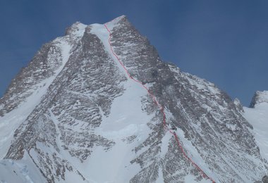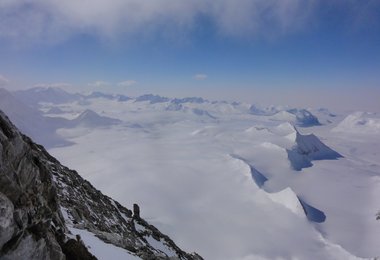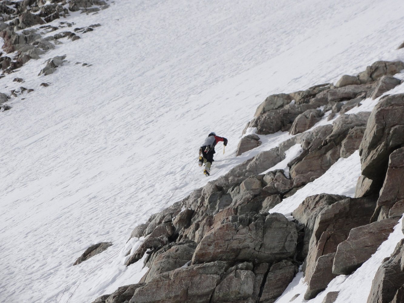 Kurze Zeit später stieg Hans als Führender in die NO-Rinne ein und gewann entlang der freiliegenden Fixseile schnell an Höhe. Das Eis war griffig und gut zu klettern. Da ich sicherte, überholte mich Chris. Ich dachte, er wollte dann über ein Schneeband zum Grat klettern, aber nach ca. 50 m klinkte er seinen Karabiner in unser Seil und wartete.