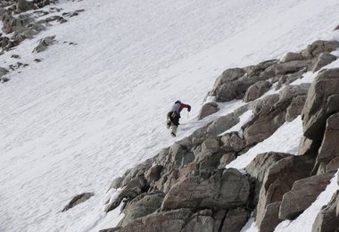 Als ich bei ihm war, fragte ich, was das sollte? Er sagte mir nur, ich sollte ihn sichern. Ich konnte es nicht glauben. „Kein Bitte, kein Danke, kein Garnichts“. Mit einer doppelt langen Bandschlinge sicherte ich Chris in unser Seil. Nun war von seinem Vorhaben, alleine über den Grat zu klettern nichts mehr übrig. Gemeinsam kletterten wir weiter.