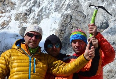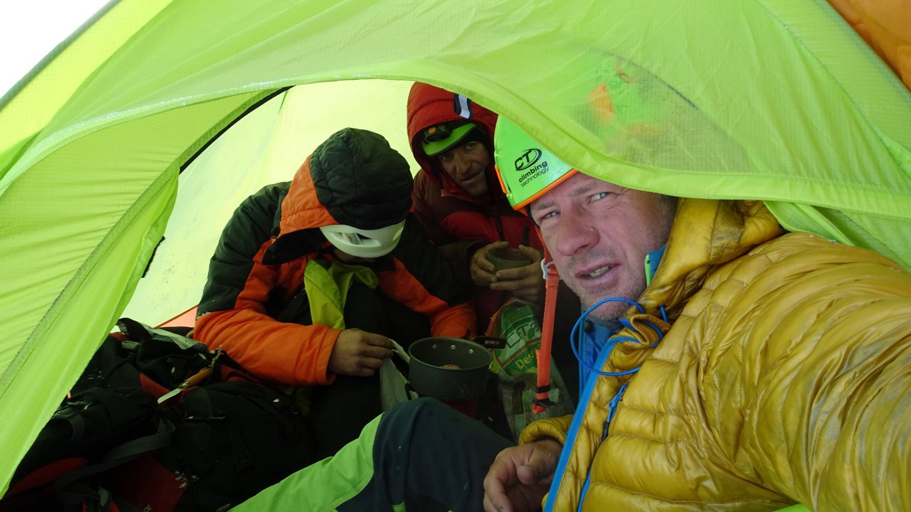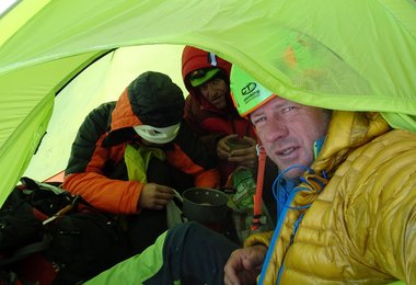 „Unser letztes Lager war auf 6670 m, wir kletterten dreieinhalb Tage, bis wir das vierte Lager erreichten. Dort mussten wir aber wegen des starken Windes die Kletterei unterbrechen, der Himmel war zwar glasklar, aber der Sturm machte ein Weiterkommen unmöglich - Wind mit 105 Km/h und -27 Grad waren nicht gerade erbauend.“ Insgesamt verbrachten die drei Rumänen fünf Nächte in der extrem steilen Wand. „Geeignete Biwakplätze fehlten und wir waren gezwungen, die unmöglichsten Stellen herzurichten.