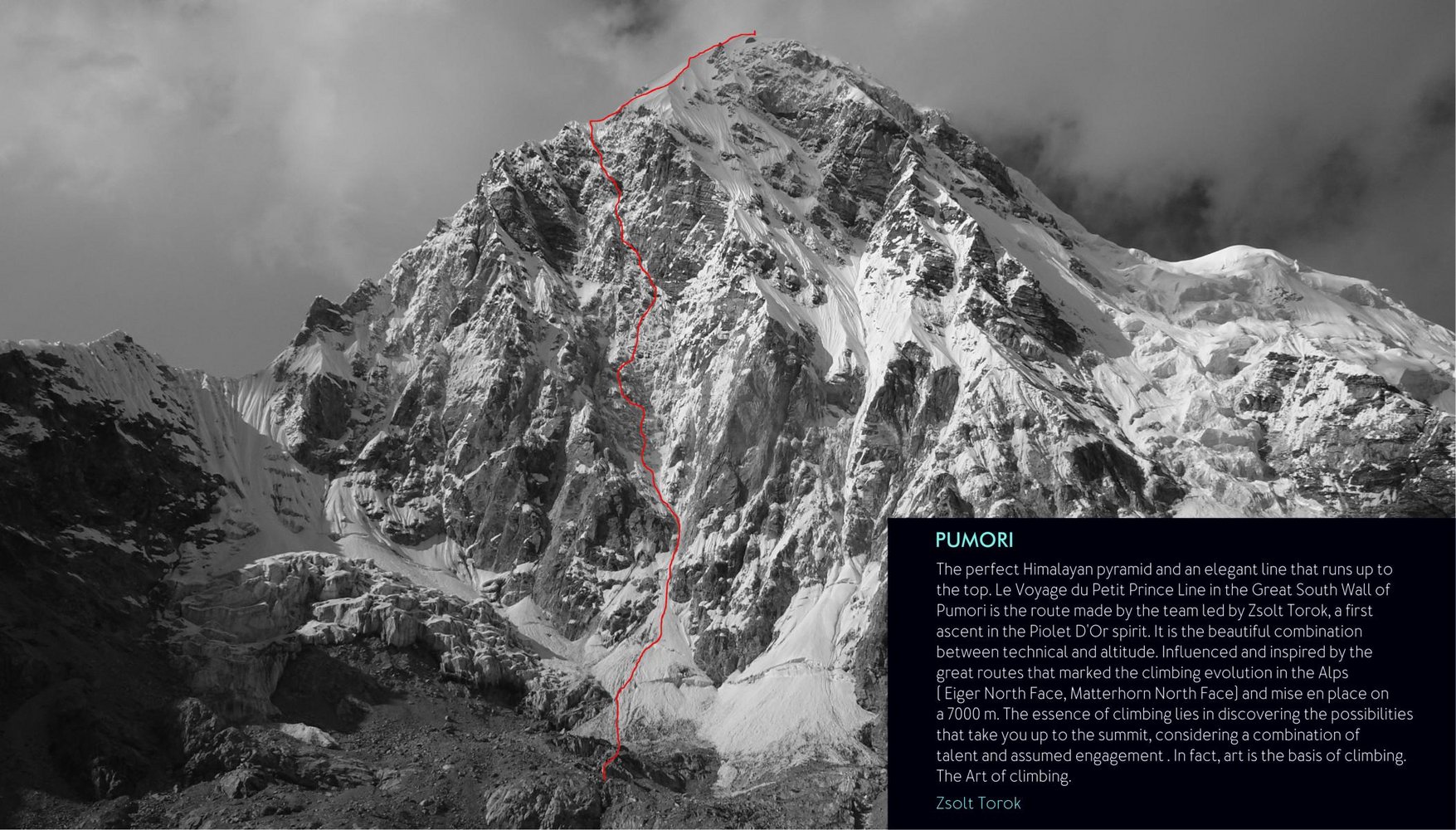„Der „Kleine Prinz“ ist eine Botschaft an die Gesellschaft – genau das soll auch unsere Linie am Pumori sein. Es ist eine klare Linie auf der wir mit einem Minimum an Ausrüstung unterwegs waren und auch keine Ausrüstung in der Wand zurück gelassen haben.“ erklärt Zsolt Torok. Die Route ist eine lange, schwierige Mixed-Kletterei am 7161 m hohen Pumuri, gegenüber dem Everest.  Zsolt  hatte die Route schon im Frühjahr 2017 mit seinem Landsmann Vlad Capusan versucht, sie mussten jedoch wegen zu hoher Lawinengefahr aufgeben.