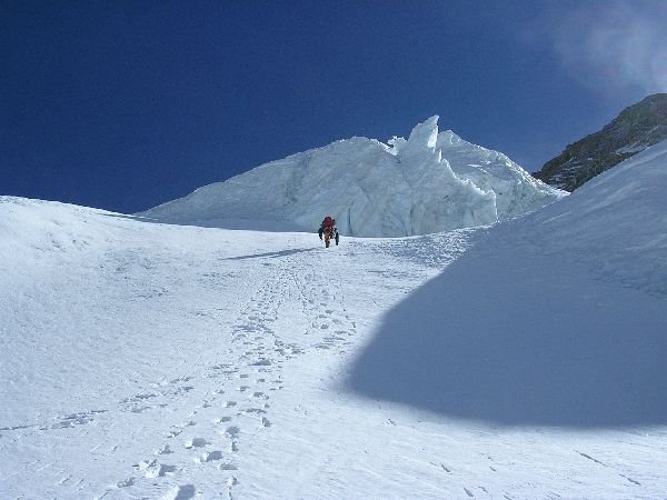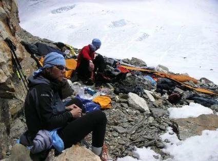 Immer noch weiter zog sich der Weg von unserem Tiefschnee-Basislager bis zum eigentlichen Basislager auf 5200 m. Schon vier Stunden waren wir unterwegs. Endlich bei einer kleinen Anhöhe konnten wir unser heimatliche Gefühle erweckendes "Lake-Side-Resort" vom vergangen Jahr erkennen.