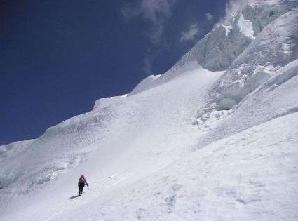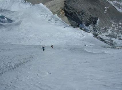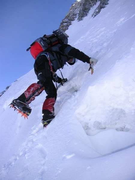 !!Endlich "richtiges" Bergsteigen!!: der dritte Tag brach wunderschön an. Noch vor den ersten Sonnenstrahlen pickelten wir uns langsam die breite Rinne des Aufstiegs nach oben. Lange Blankeisstrecken auf den Frontzacken unterbrochen von weniger anstrengenden Hartschneepassagen. Schon im Aufstieg richteten wir bei den steileren Blankeisstellen einige Abalakov-Eissanduhren zum Abseilen für den Abstieg ein. Wir hatten es nicht eilig und wollten eher auf Nummer-"Sicher" gehen.