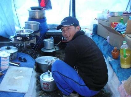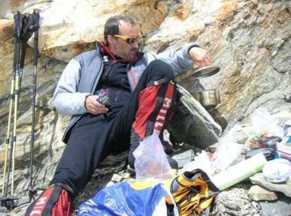 Die Hoffnung hielt uns bis 22:30 Uhr auf drei Felsblöcken kauernd im leichten Schneefall fest. Die wärmende Ausrüstung hatte wir am Ausgangspunkt für die Shisha Pangma-Südwand kurz unterhalb des Castle-Camps deponiert und so schlotterten wir der Sichtbesserung entgegen. Die auch kurz nach 22:30 eintraf. Um 00:30 waren wir im Basislager zurück, wo unser Koch Sitaram uns noch das erträumte Abendessen zauberte - genau 2000 Höhenmeter tiefer als beim morgendlichen Aufwachen.