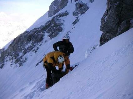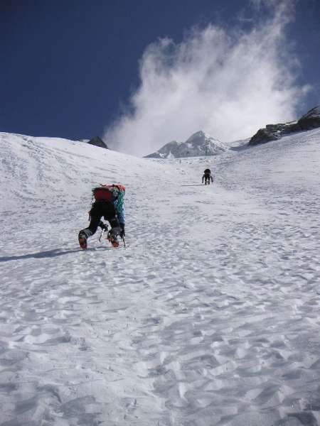 Da wir beim Aushacken unserer kleinen Zeltplattform schnell auf blankes Eis stiessen, waren wir doch 2 1/2 Stunden mit dem Herrichten des "Zeltplatzes" beschäftigt. Als der Sturm seinen Höhepunkt erreicht hatte, waren wir endlich so weit das Zelt auftstellen zu können. Auf 6650 m in einem Höllen-Sauwetter eine echte Herausforderung: 1,5 Meter x 2 Meter war unser Spielfeld im Kampf mit dem Sturm in einer 50° steilen Flanke.
