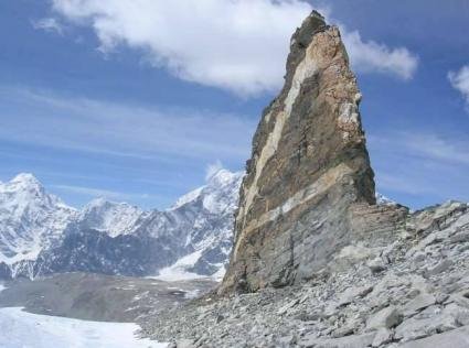 Ausschlafen am nächsten Morgen, bis uns die Sonne aus den Schlafsäcken trieb. Wir hatten zwar gut geschlafen auf 5650 m, aber wir hatten auch gemerkt, dass wir für diese Höhe bei weitem noch nicht genügend angepasst waren. Der Entschluss uns nicht zu sehr zu verausgaben und damit den Gipfel des Pungpa Ri (7400 m) erst mal sausen zu lassen war ohne grosse Worte allen dreien klar. Also stiegen wir an diesem zweiten Tag auch nur bis zum Castle-Camp (5850 m) auf. Doug Scott hatte 1982 einer kleinen Felsformation am Ende des oben genannten Moränenrückens diesen Namen gegeben. Nach 1 1/2 Stunden waren wir angekommen und damit direkt am Einstieg zur Aufstiegsrinne des Pungpa Ri. Wir verbrachten den Rest des Tages mit Herrichten der Ausrüstung für den nächsten Tag und mit Schneeschmelzen.