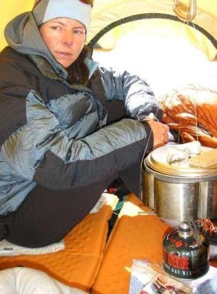 Wir konnten das Spiel gewinnen und lagen irgendwann kurz vor Sonnenuntergang eng zusammengepfercht in den Schlafsäcken. Hiro und ich in der einen Richtung, Gerlinde in der Mitte eingezwängt in der anderen Richtung. Bis lang in den Abend brummte der Kocher, um das nötige Schmelzwasser herzubringen. Unser mitgebrachtes Kartoffelpurée war versehentlich salzfrei - und so schmeckte dieser Brei mehr nach Pappe als nach Kartoffeln.