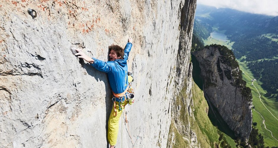 Michi Wohlleben klettert als Erster die alpine Mehrseillängen-Tour „Parzival“(8b) im Alpsteingebirge frei...